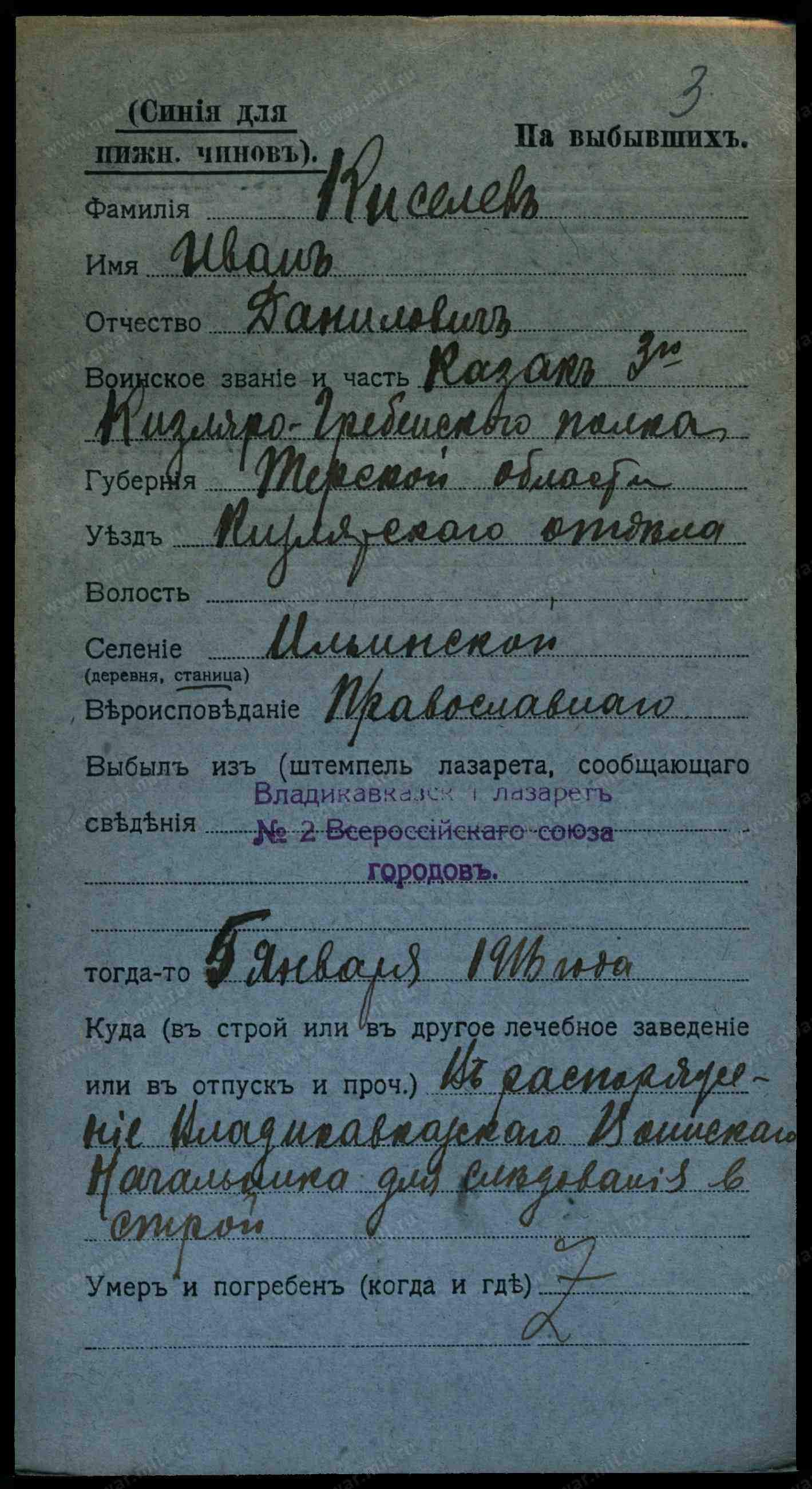 3. Кисилев Леон Данилов, сын, 18 лет, казак, родился здесь, правосл., родной язык русский, неграмотный, земледелец при отце.