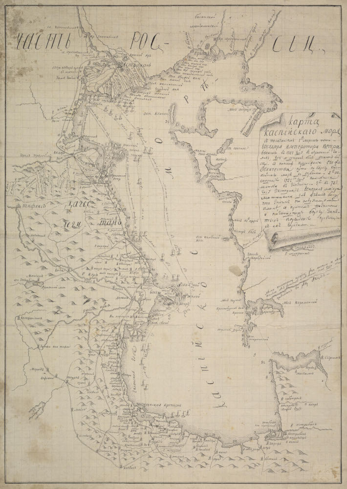 Рукописная карта Каспийского моря с показанием первого морского пути государя Петра Великого в 1722 г.
