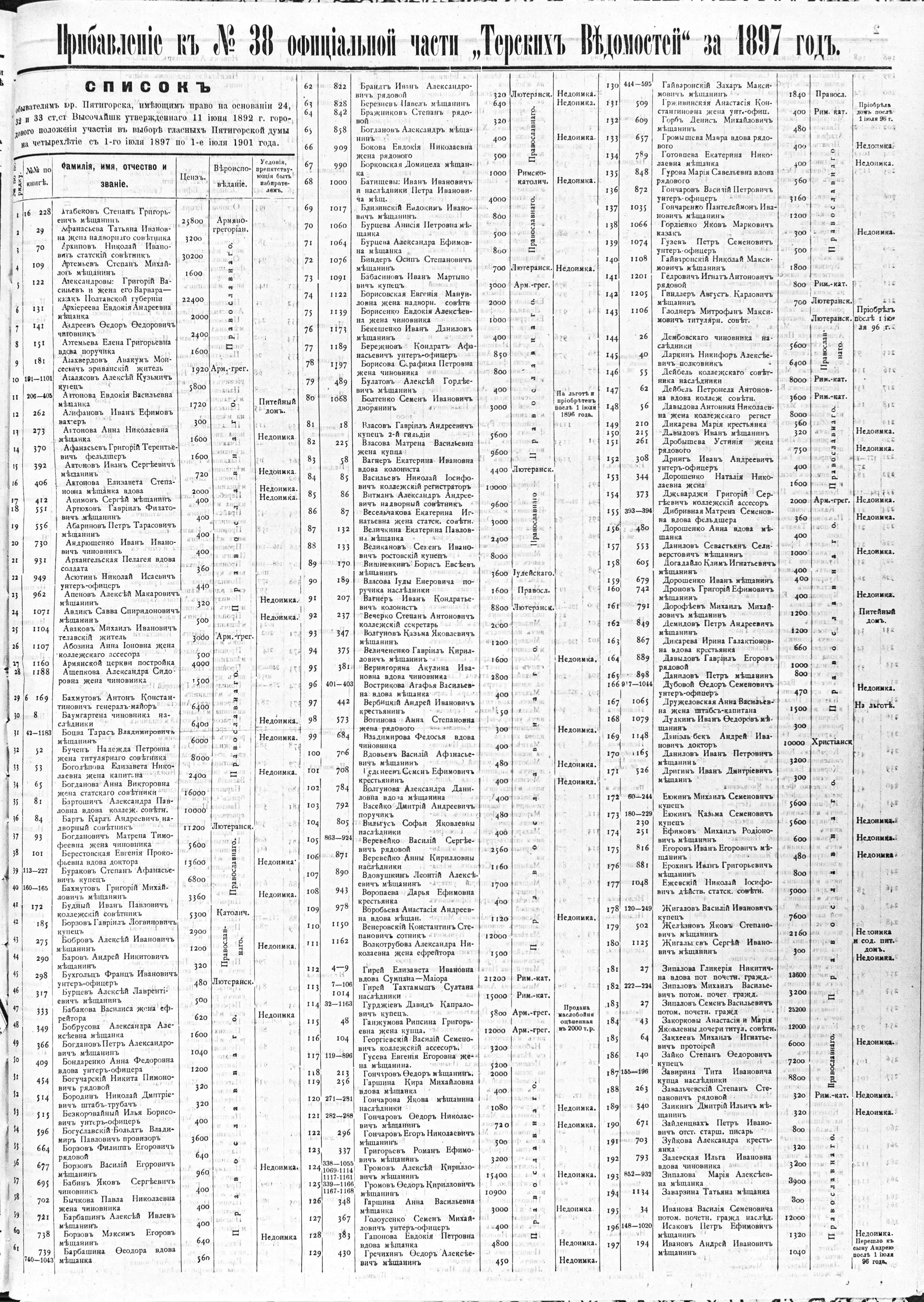 Прибавление къ № 38 офицiальной части «Терскихъ Вѣдомостей» за 1897 годъ.