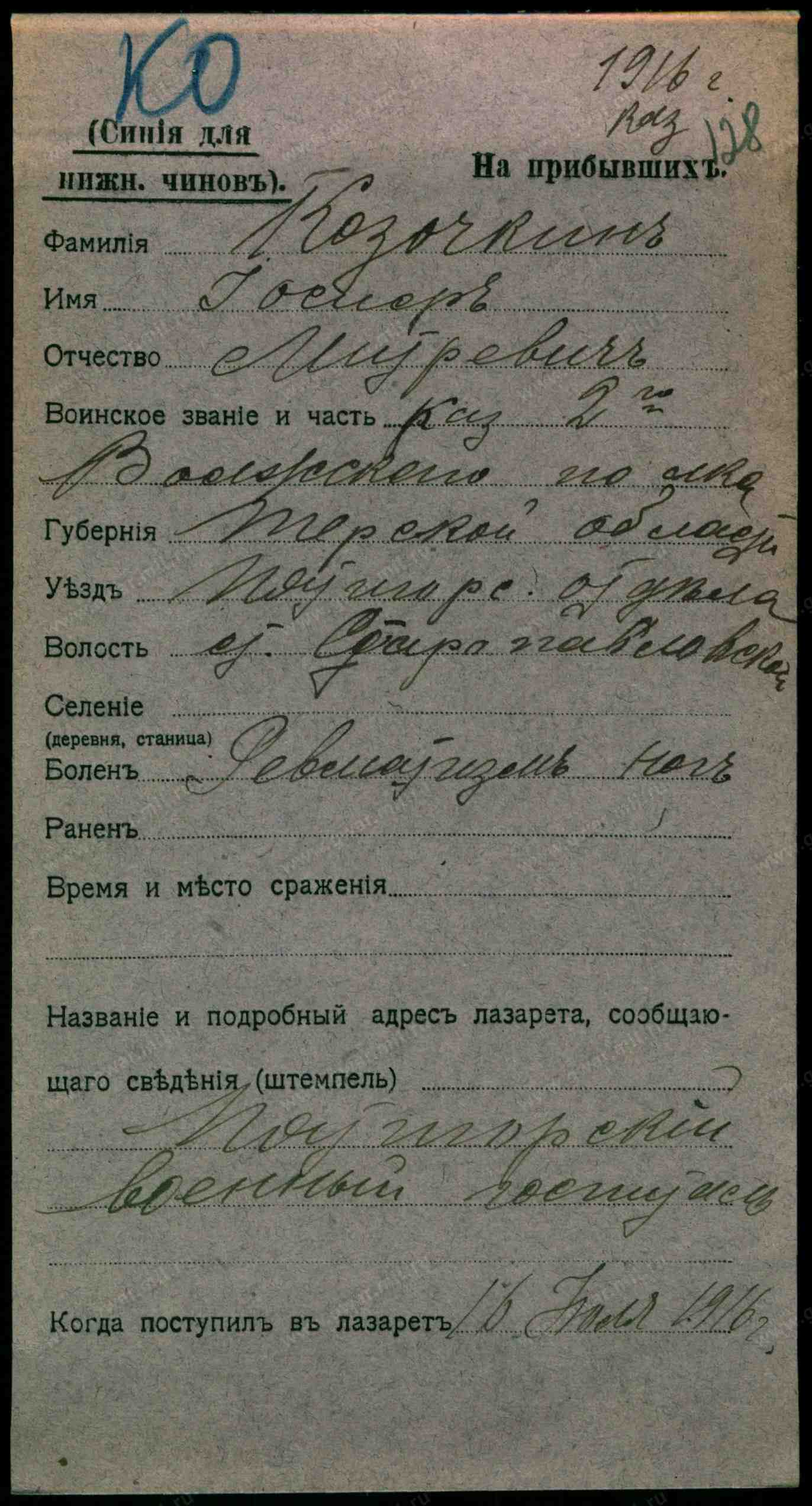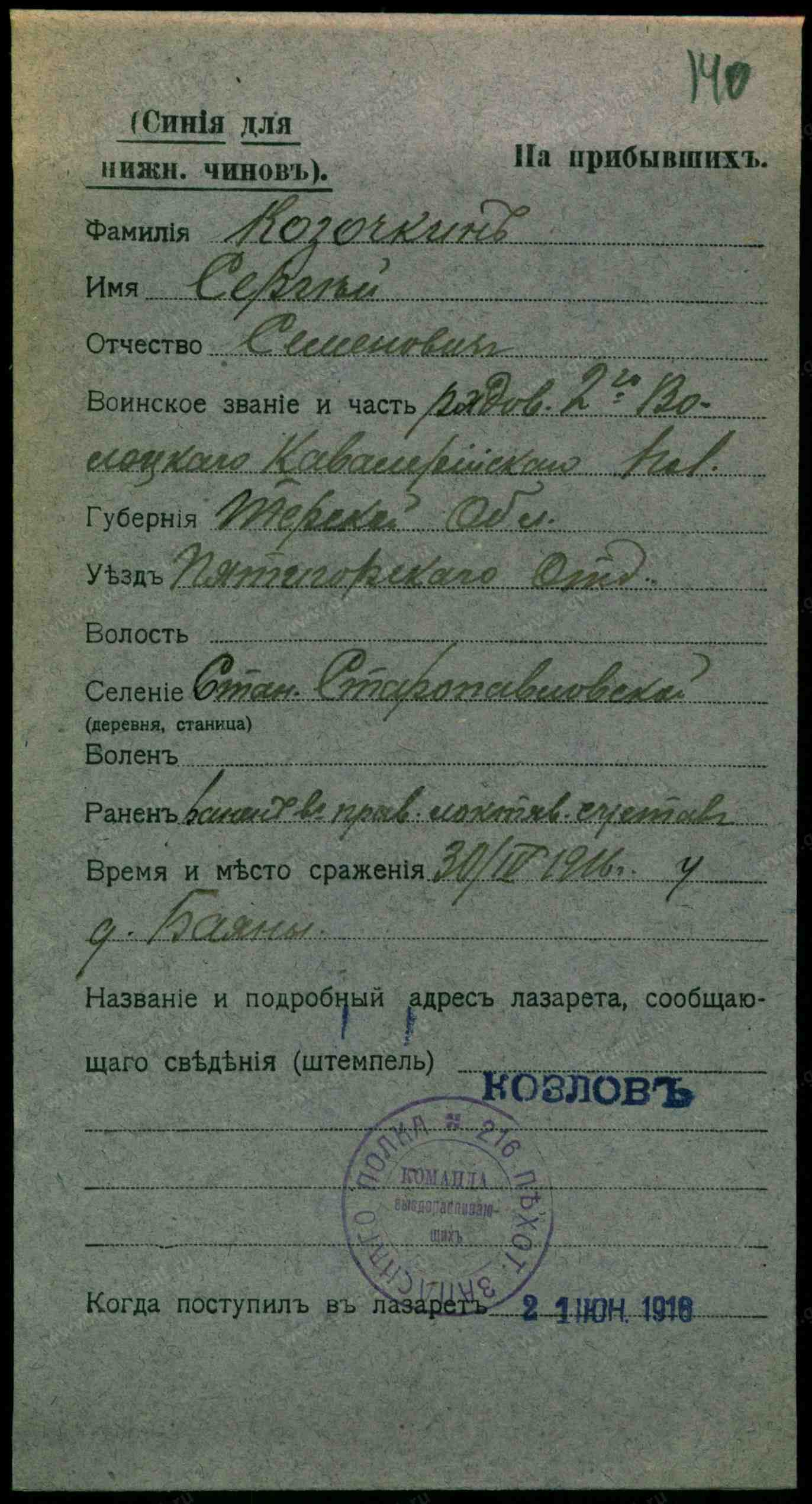Место рождения Терская обл., Пятигорский отдел, Старопавловская станица