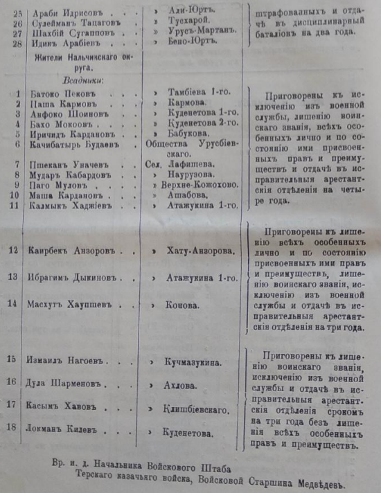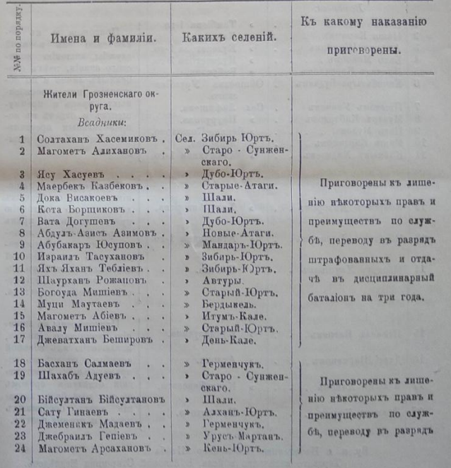 28 человѣкъ подсудимыхъ чеченцевъ лишить нѣкоторыхъ правъ и преимуществъ по службѣ, перевести въ разрядъ штрафованныхъ и отдать въ дисциплинарные баталіоны, а именно: 1) Хасемикова, 2) Алиханова, 3) Хосуева, 4) Казбекова, 5) Високоева, 6) Борщикова 7) Догушева, 8) Азимова, 9) Беширова, 10) Авала Мишіева, 11) Багауда Мишіева, 12) Тебліева, 13) Тасуханова, 14) Юсупова, 15) Маутаева, 16) Абіева и 17) Рожапова - на три года каждаго; 18) Арабіева, 19) Сугаппова, 20) Дацагова, 21) Идрисова, 22) Арсаханова, 23) Гапіева, 24) Мадаева, 25) Гинаева, 26) Бійсултанова, 27) Адуева и 28) Салманова на два года каждаго.