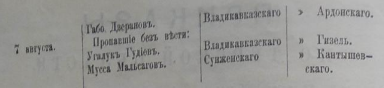 Начальникъ 3-го участка, Владикавказскаго округа, подполковникъ Мардановъ, согласно его просьбы и ходатайства начальника округа, увольняется мною въ пятнадцатидневный отпускъ въ Дагестанскую область по домашнимъ обстоятельствамъ съ сохраненіемъ содержанія, на время его отпуска завѣдываніе участкомъ возлагаю на старшаго оберъ-офицера для особыхъ порученій при мнѣ, по званию Начальника области и Наказнаго Атамана, капитана князя Макаева.