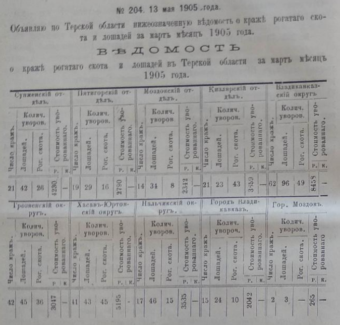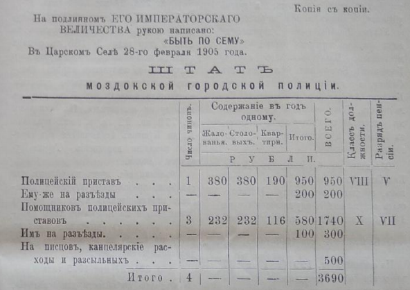 Объявляя объ этомъ, предлагаю Моздокскому полиціймейстеру войсковому старшинѣ Зерщикову теперь же сдать на законномъ основаніи всѣ дѣла, имущество и суммы Моздокской городской полиціи въ вѣдѣніе атамана Моздокскаго отдѣла и послѣднему немедленно войти съ представленіемъ о сформированіи моздокской полиціи по новому прилагаемому при семъ штату, а затѣмъ по окончаніи донести мнѣ съ приложеніемъ пріемо-сдаточныхъ вѣдомостей.