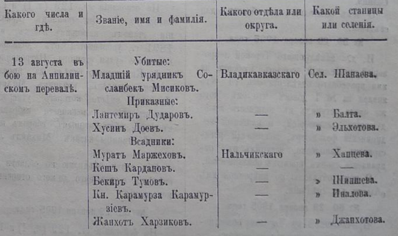 Объявляю при семъ по ввѣренной мнѣ области для свѣдѣнія списокъ воинскимъ чинамъ Терско-Кубанскаго коннаго полка, принадлежащимъ по мѣсту жительства къ составу Терской области, убитымъ въ разновременныхъ бояхъ съ японцами и стычкахъ съ хунгузами и оставшимся на полѣ сраженія неизвѣстно убитыми или ранеными.