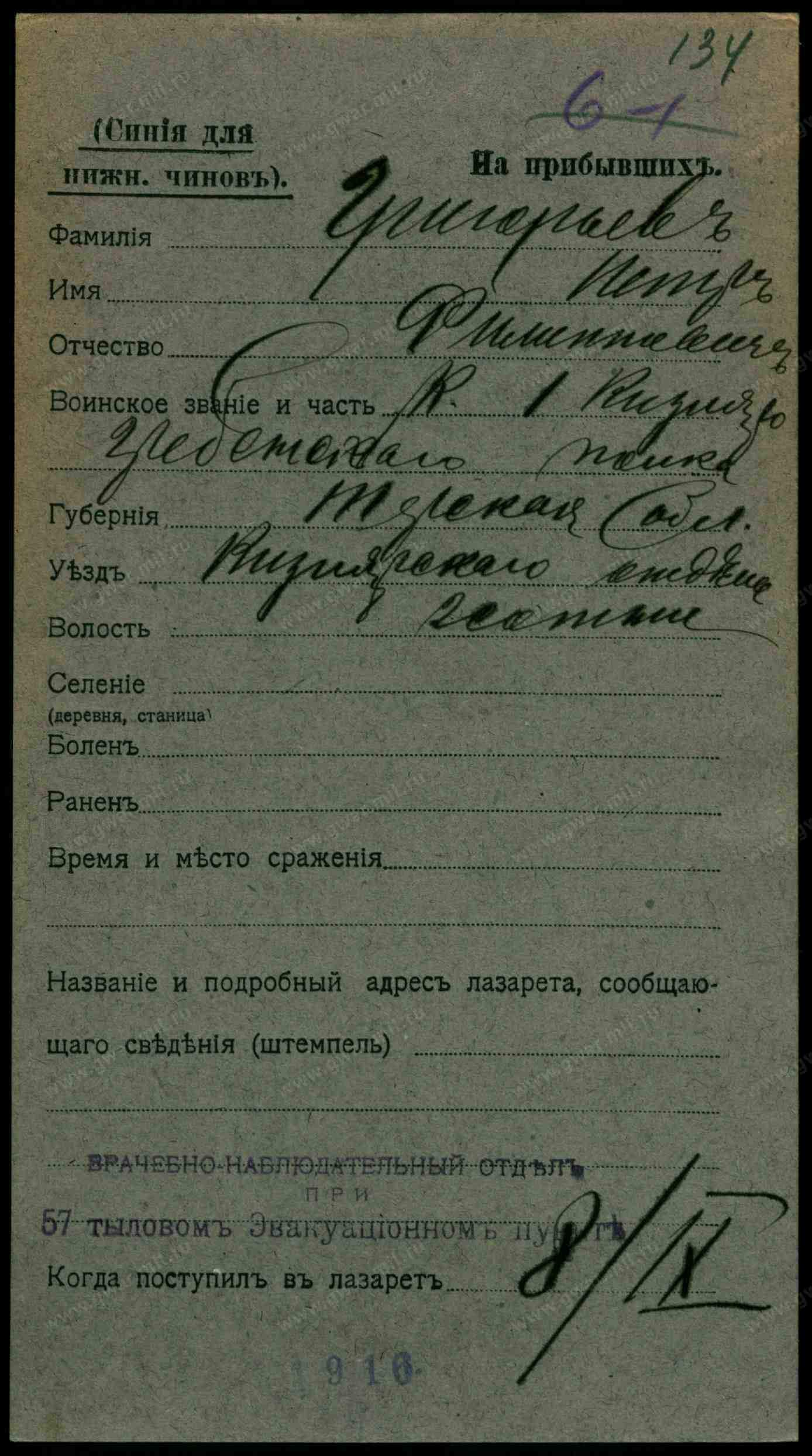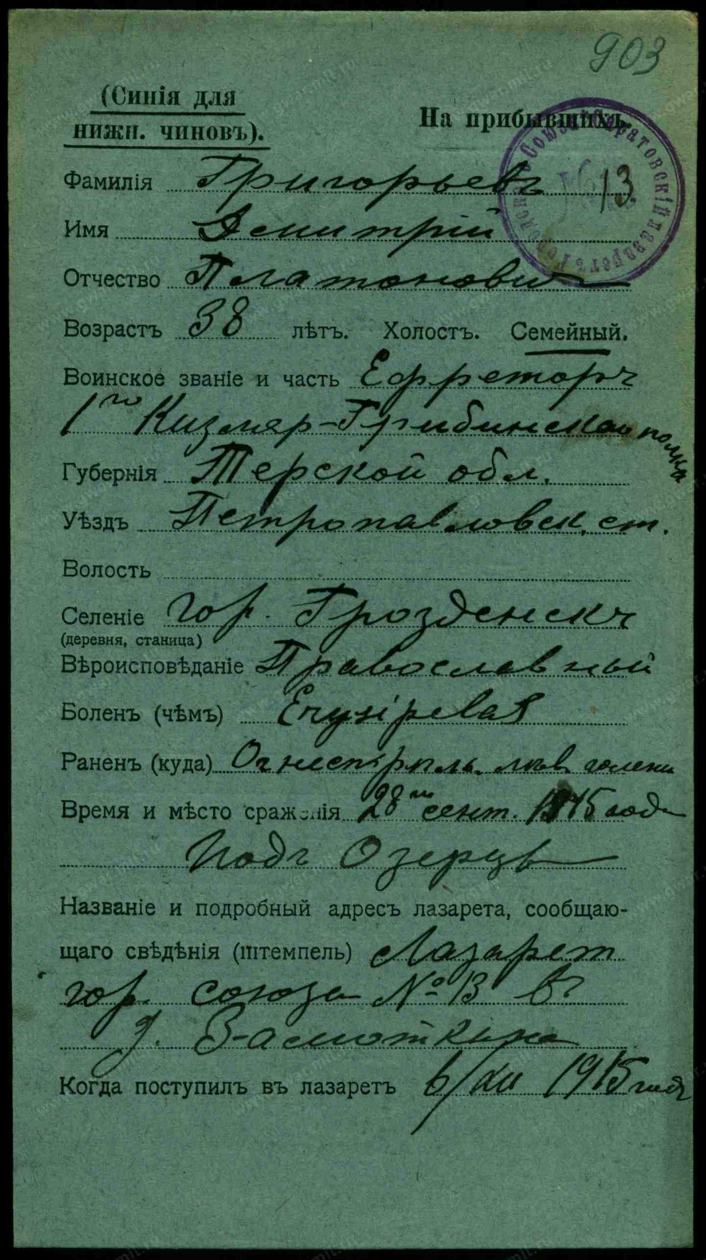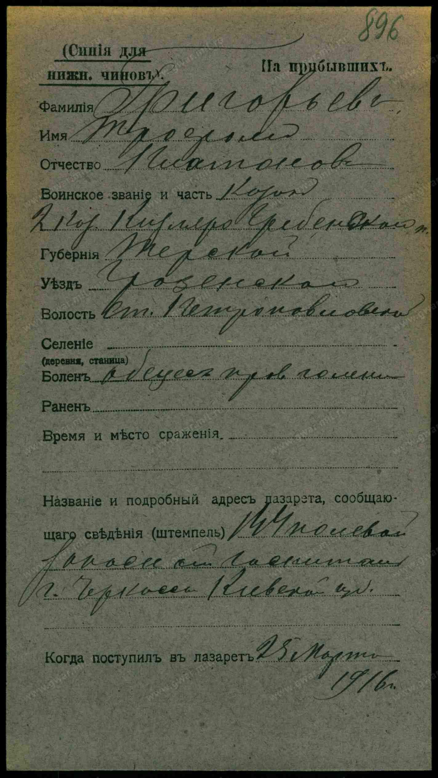3. Григорьев Иосиф Платонов, сын, 20 лет, казак, родился здесь, прав., родной язык русский, неграмотный, земледелец при отце, казак приготовительного разряда.