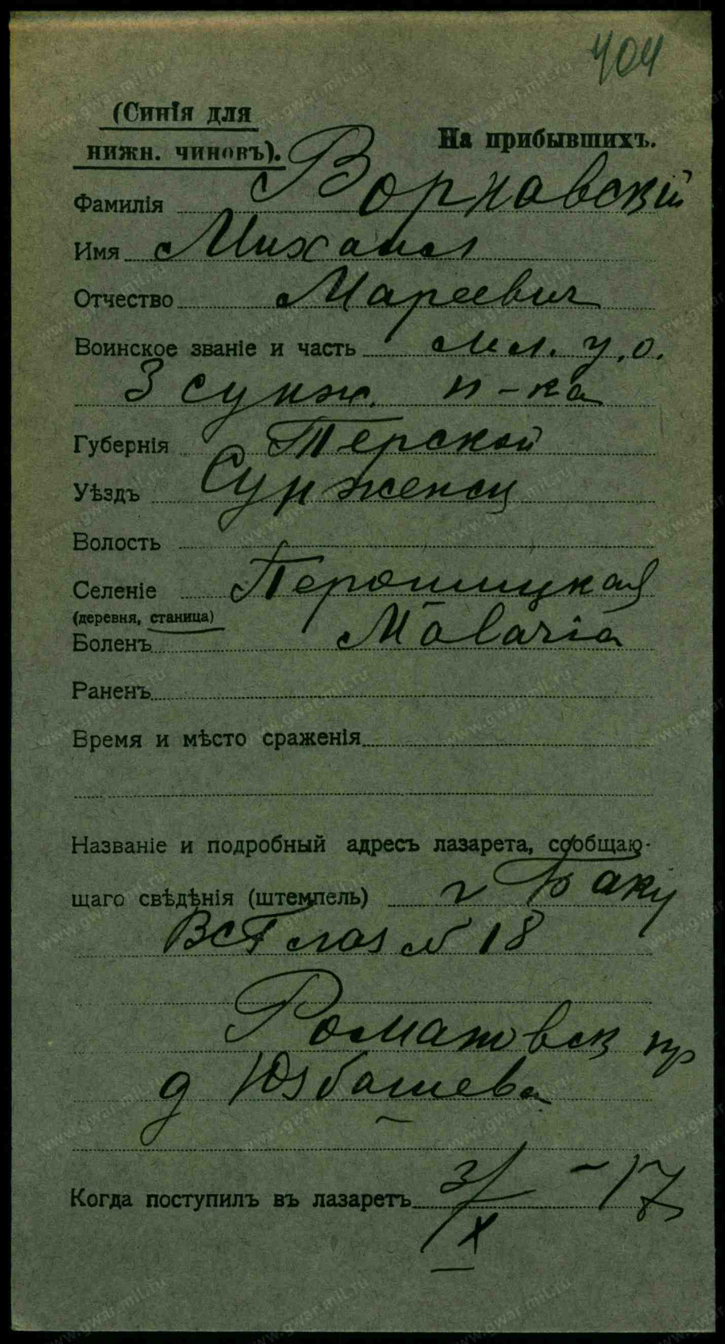 Место рождения Терская обл., Сунженский отдел, ст. Перошицкая
