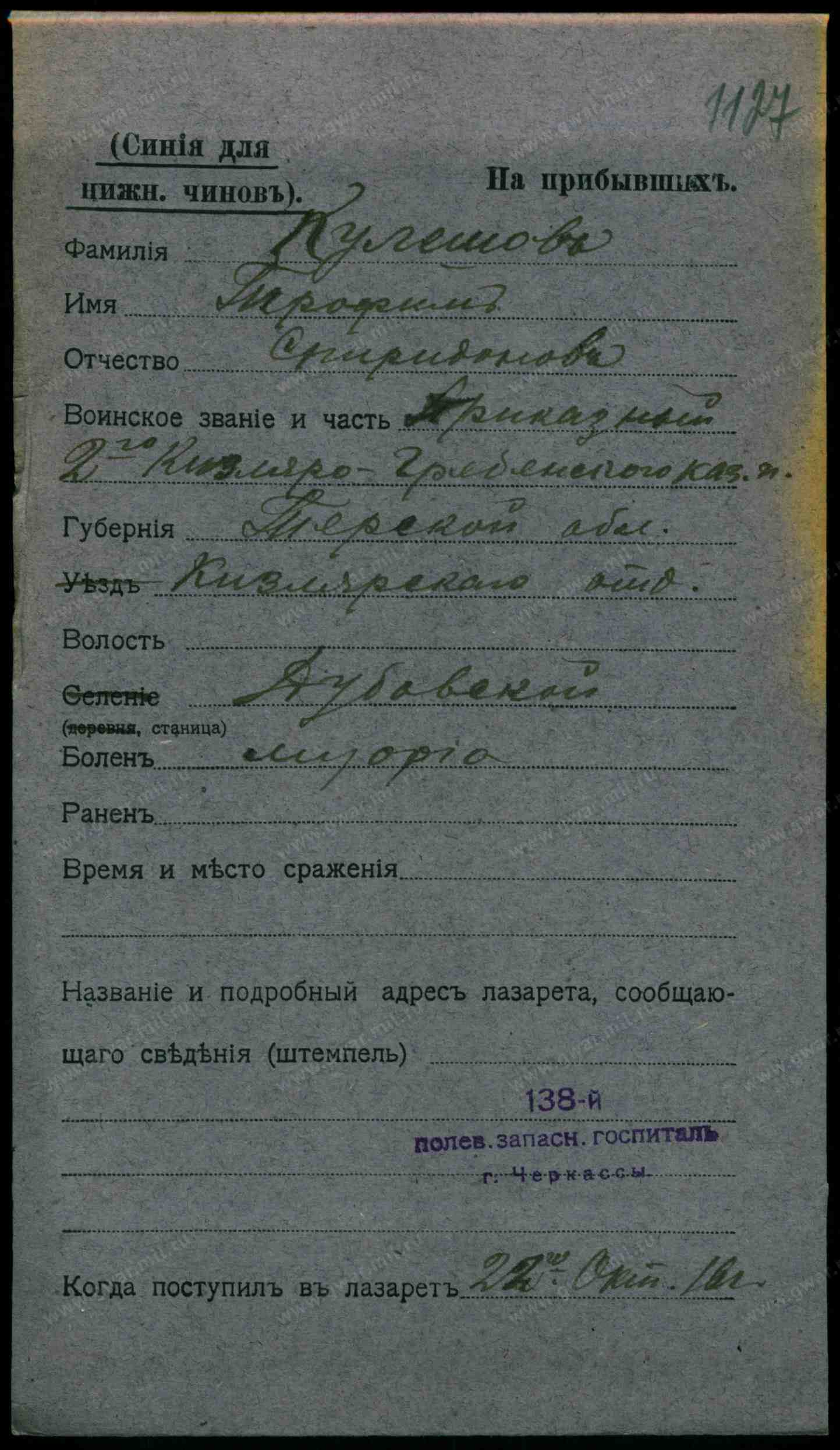 Тип документа Карточка на прибывших (нижние чины)