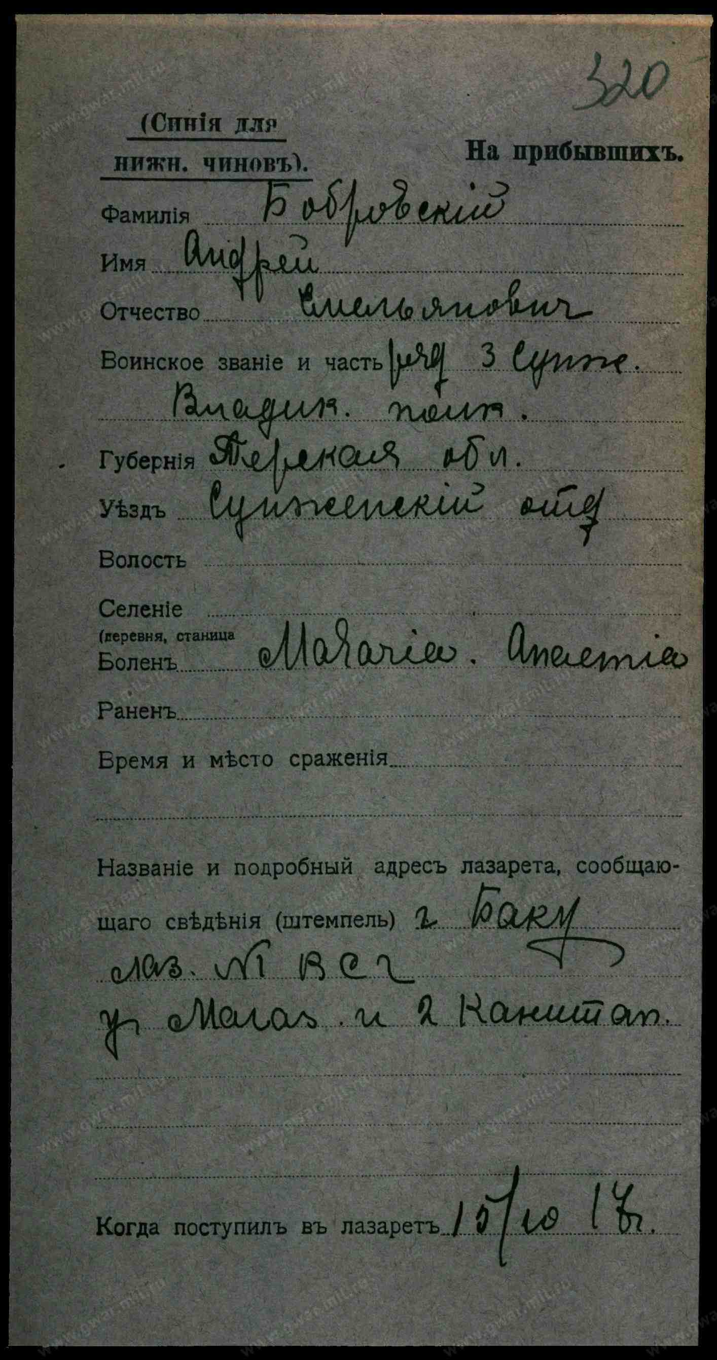 Место выбытия в Управление Сунишского отд. на Терской обл.