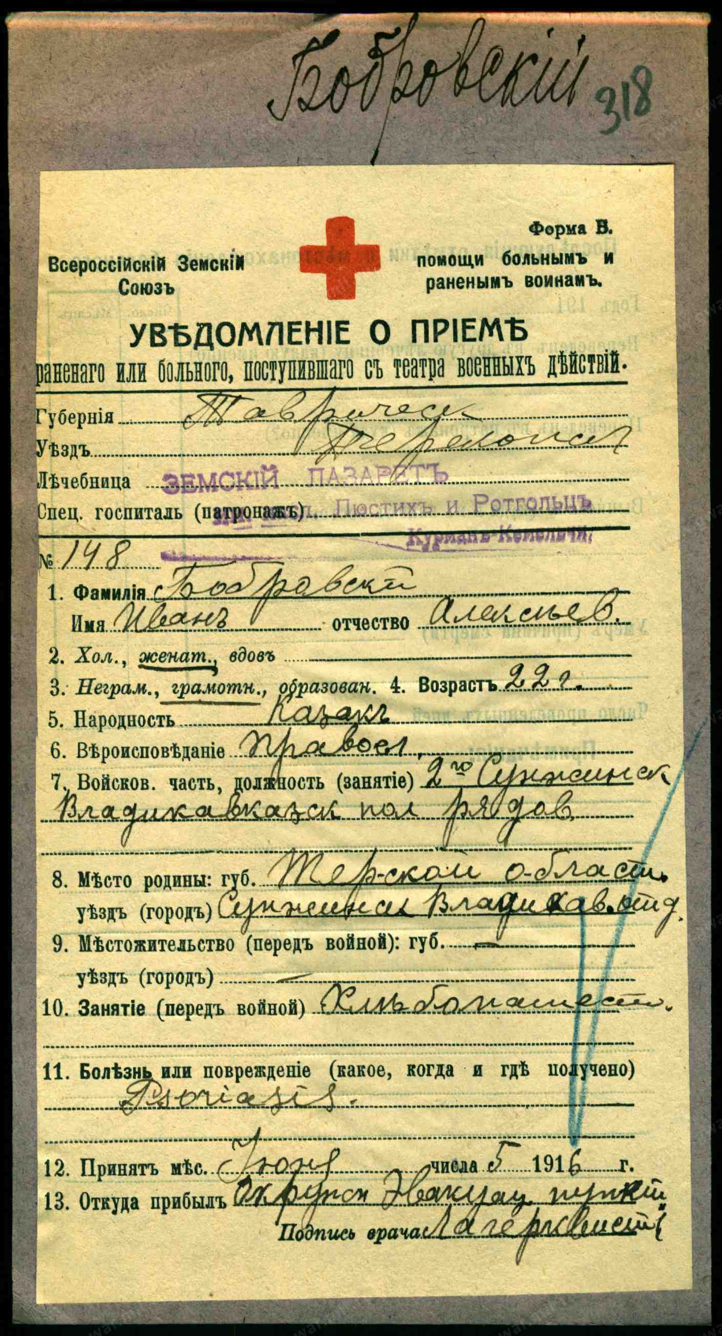 Место рождения. Губерния Терская обл.