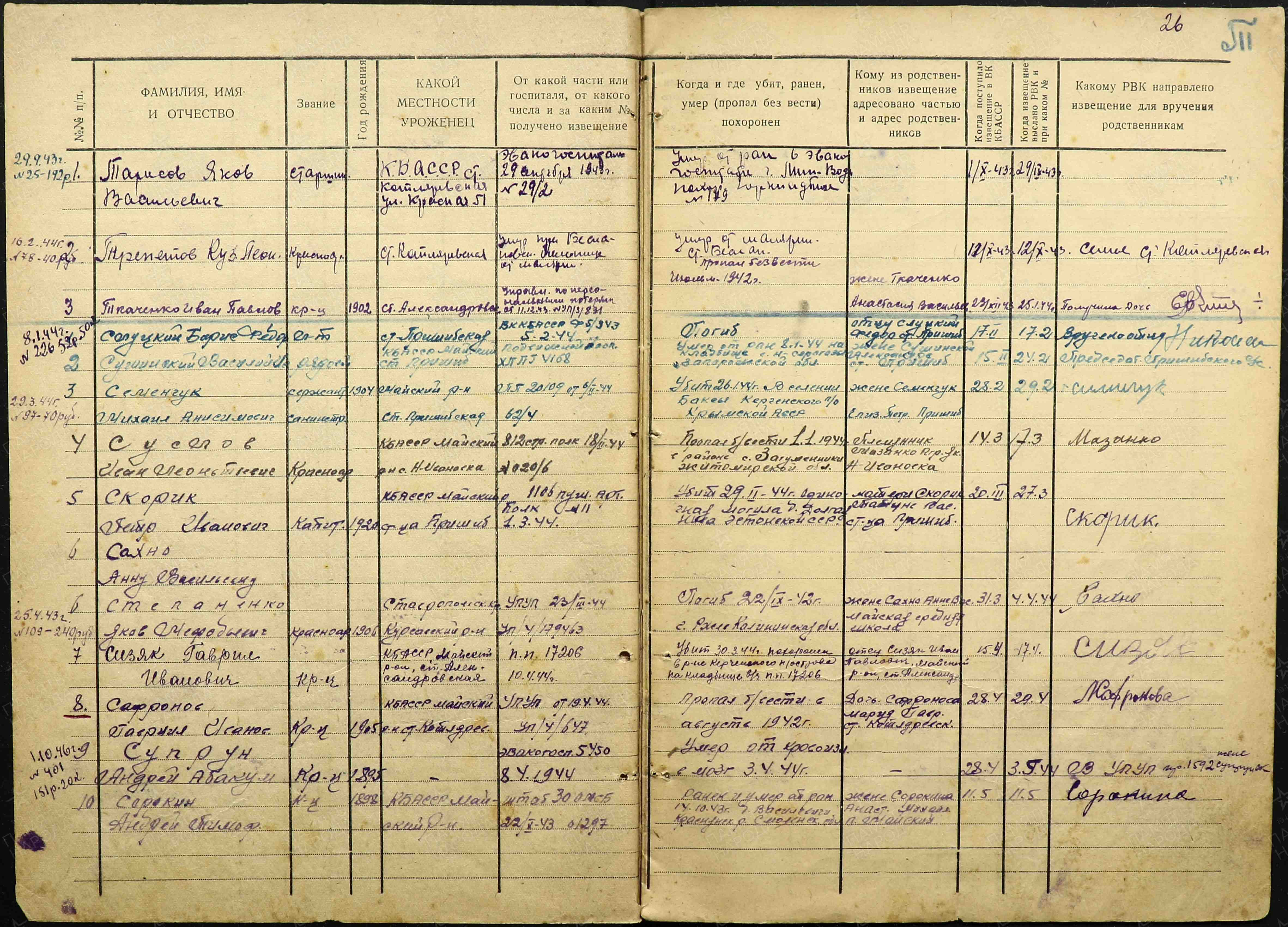 Наименование военкомата: Майский РВК, Кабардино-Балкарская АССР, Майский р-н