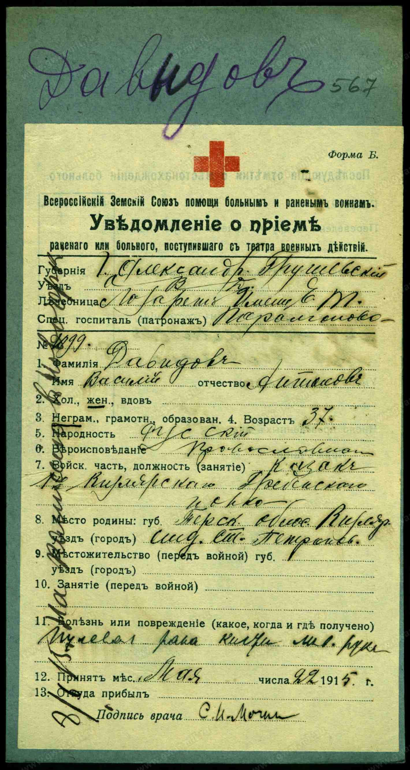 1. Давыдов Василий Ананьев, хозяин, 18 лет, холост, казак, родился здесь, прав., родной язык русский, грамотный, в ст. 1 клас. учил. МНП, земледелие-хозяин.