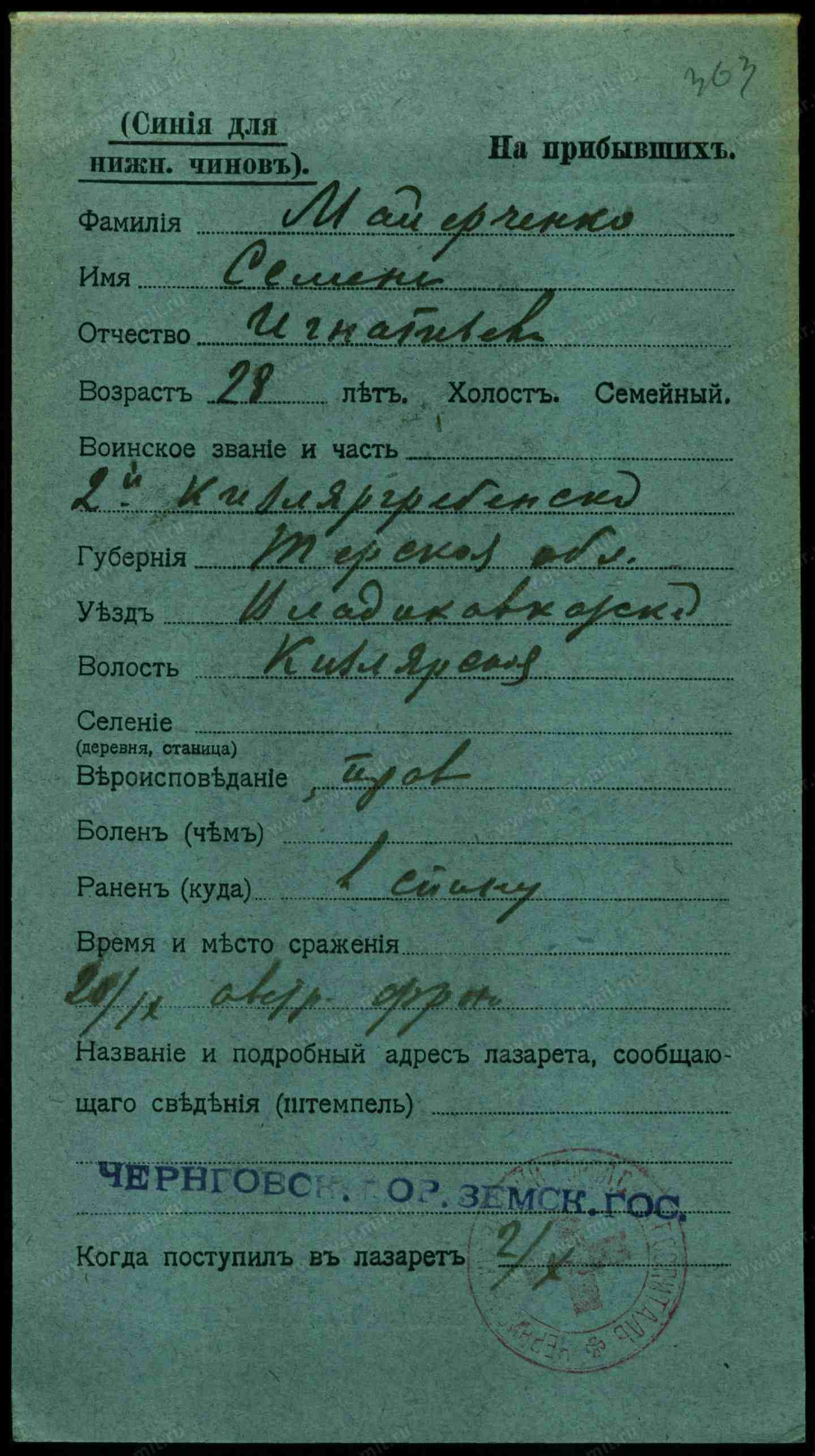 1. Майорченко Игнат Васильев, хозяин, 48 лет, казак, родился в Саратовской губ., Петровском уезде, г. Петровка, приписан здесь, правосл., родной язык русский, неграмотный, земледелец, продажа дров.