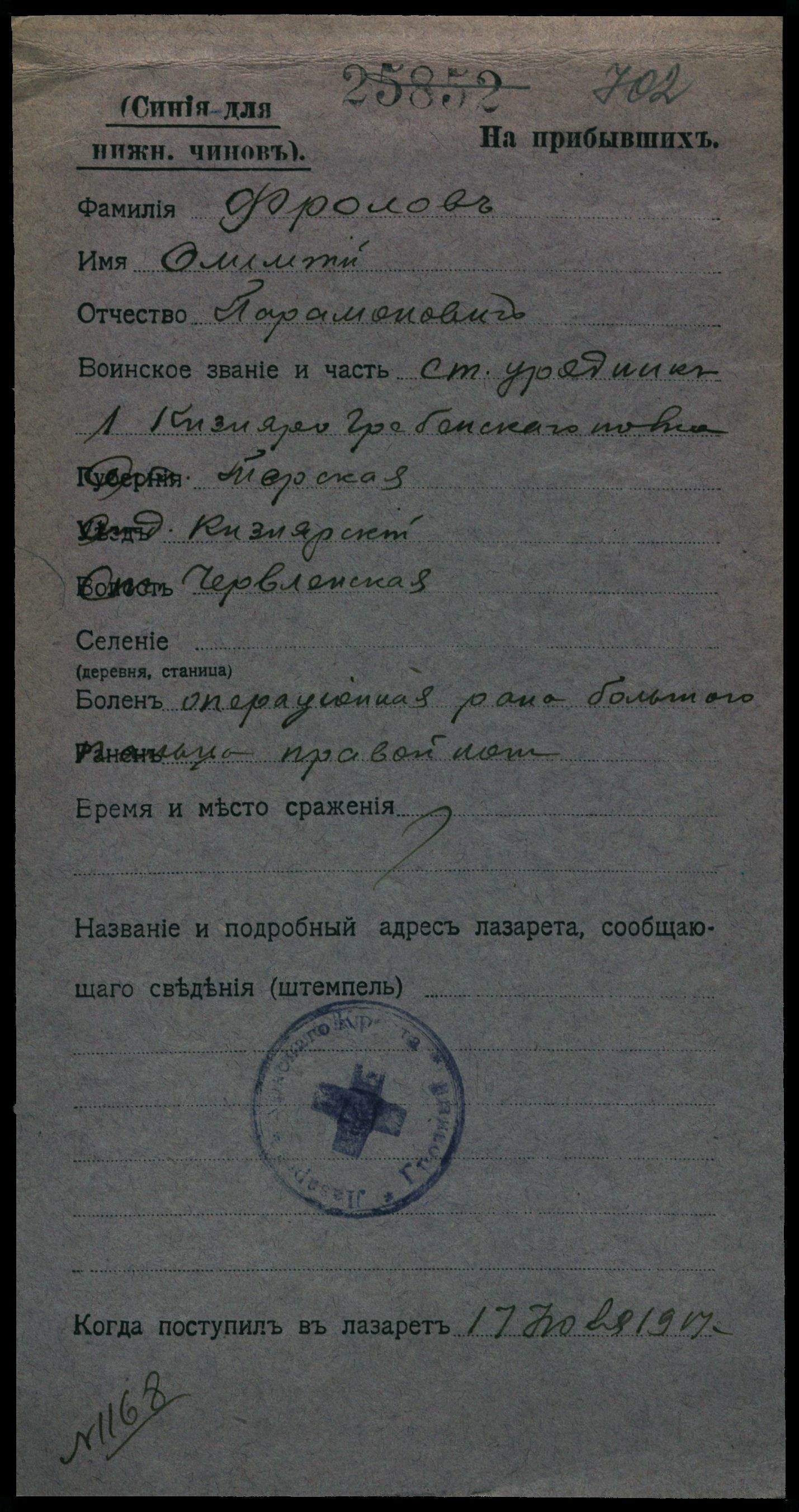 16. Приколотин Григорий Максимов, работник, 25 лет, женат, крест. из бывш. госуд., родился в Воронежской губ., Богучарском уезде, приписан в Воронежской губ., Богучарском уезде, Куликовской вол., селе Бондаревск., обыкновенно проживает здесь, правосл., родной язык русский, грамотный, у крестьянина, земледелец работник.