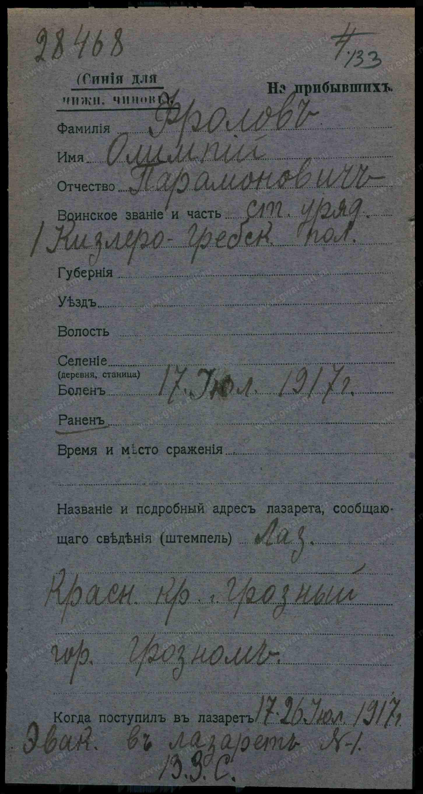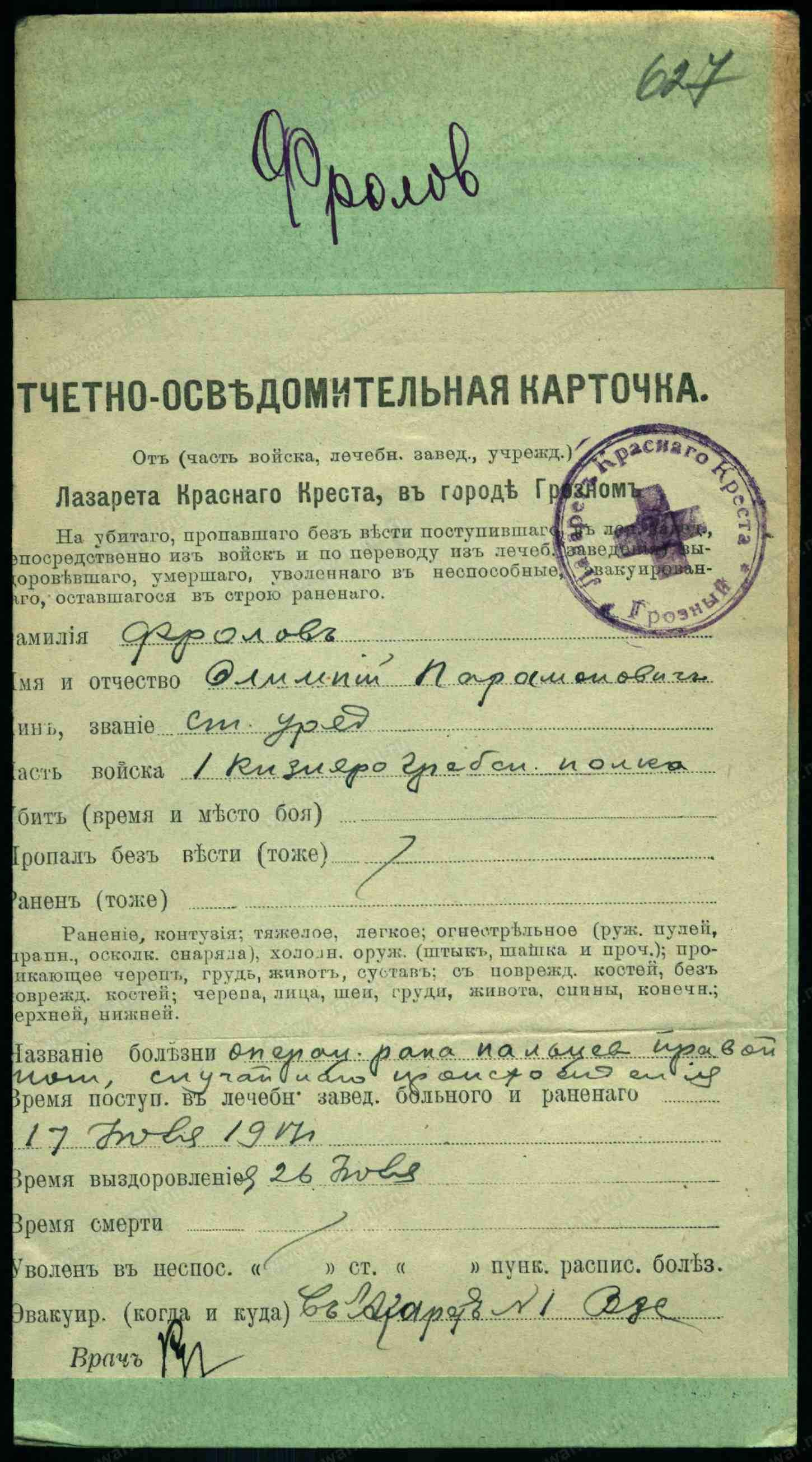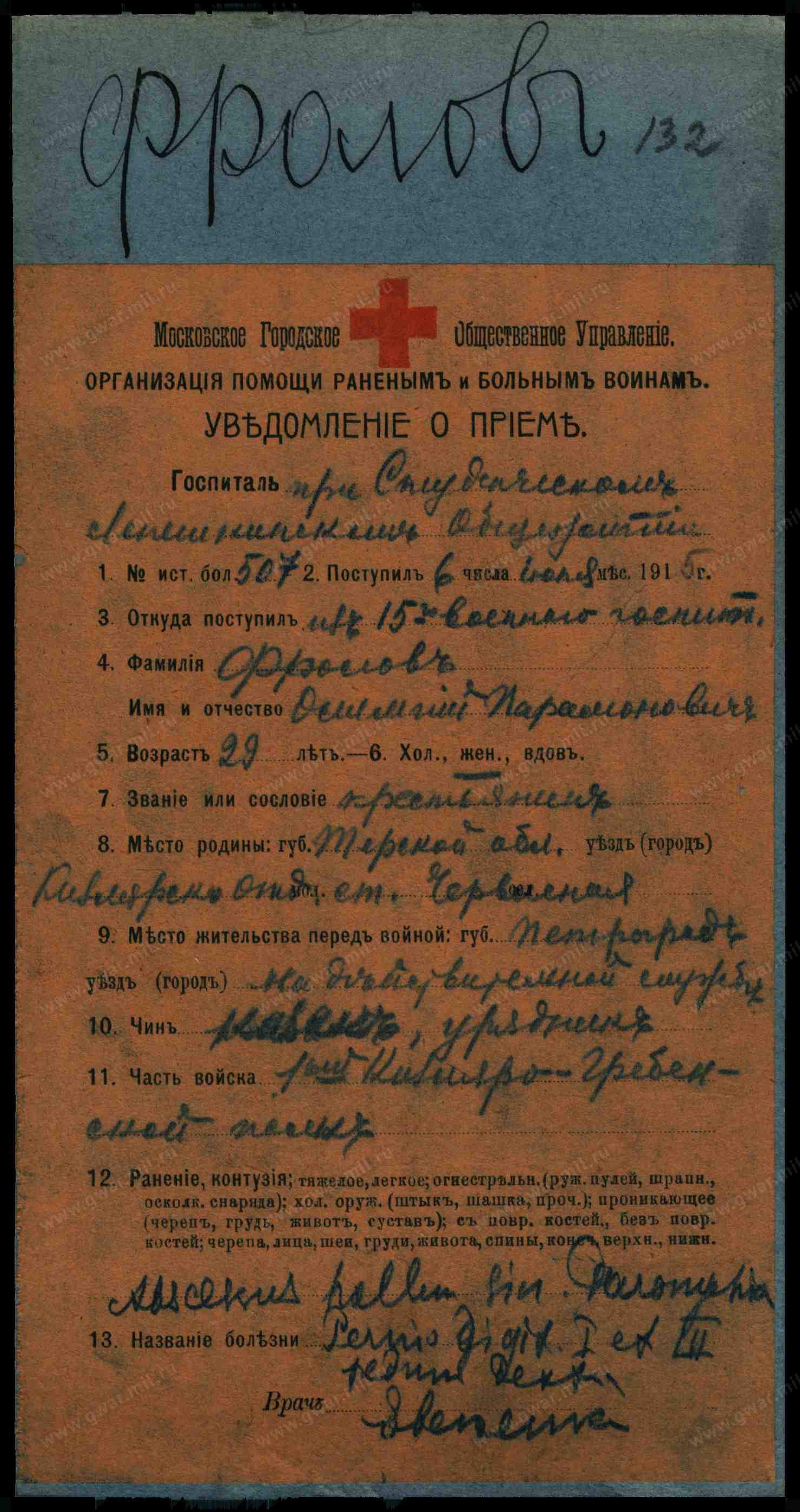 18. Червоненко Иван Евдокимов, казенная прислуга, 23 года, женат, казак, родился в Терской обл., Пятигорском отд., приписан к Марьинскому станичному общ. ТКВ, на военной службе, врем. пребыван., правосл., родной язык русский, неграмотный, казак.