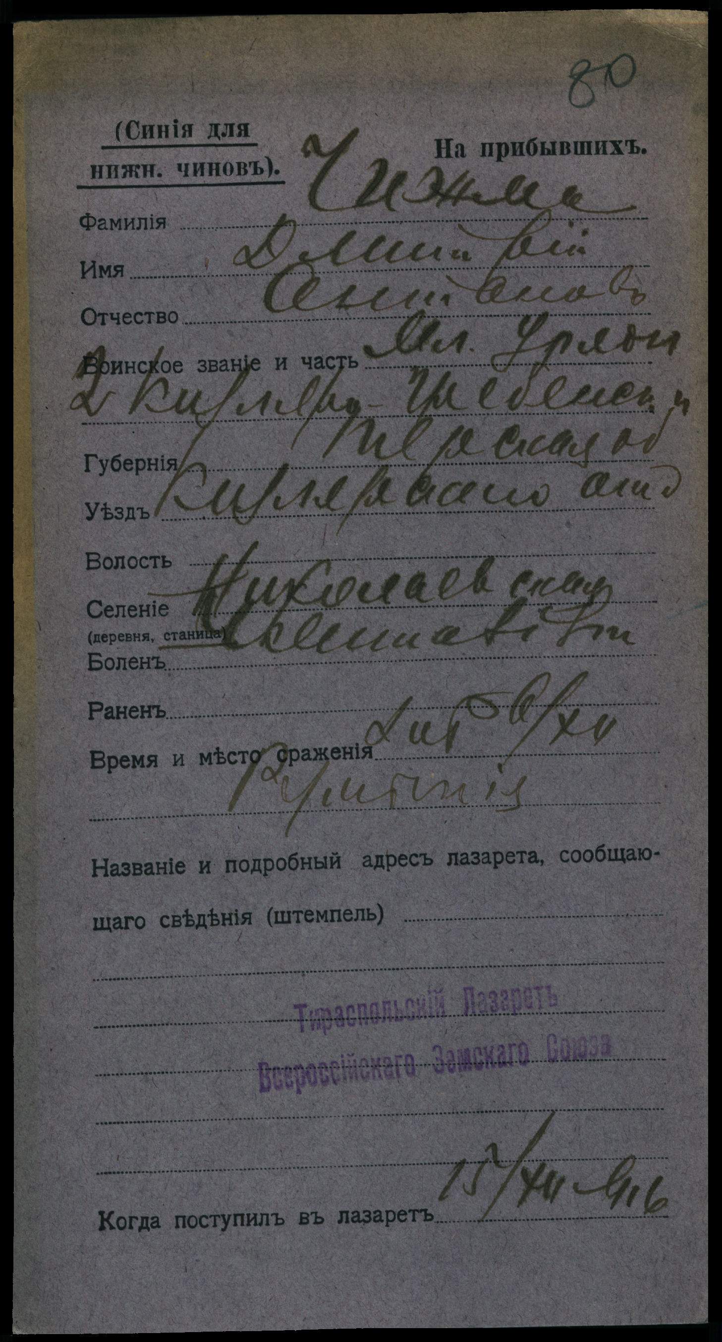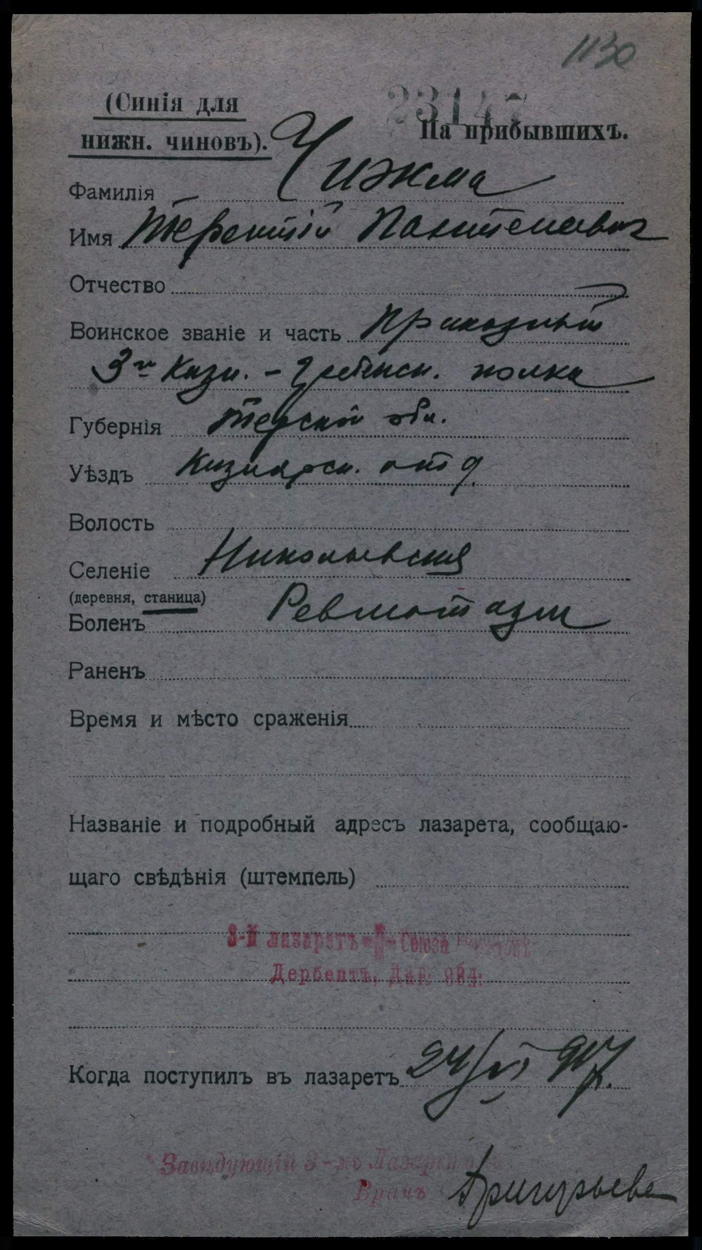 4. Чижма Иван Павлович, пасынок, 18 лет, казак, родился здесь, врем. отлуч. в ст. Шелковской, прав., родной язык русский, неграмотный, земледелец при отчиме, терский приг. казак.