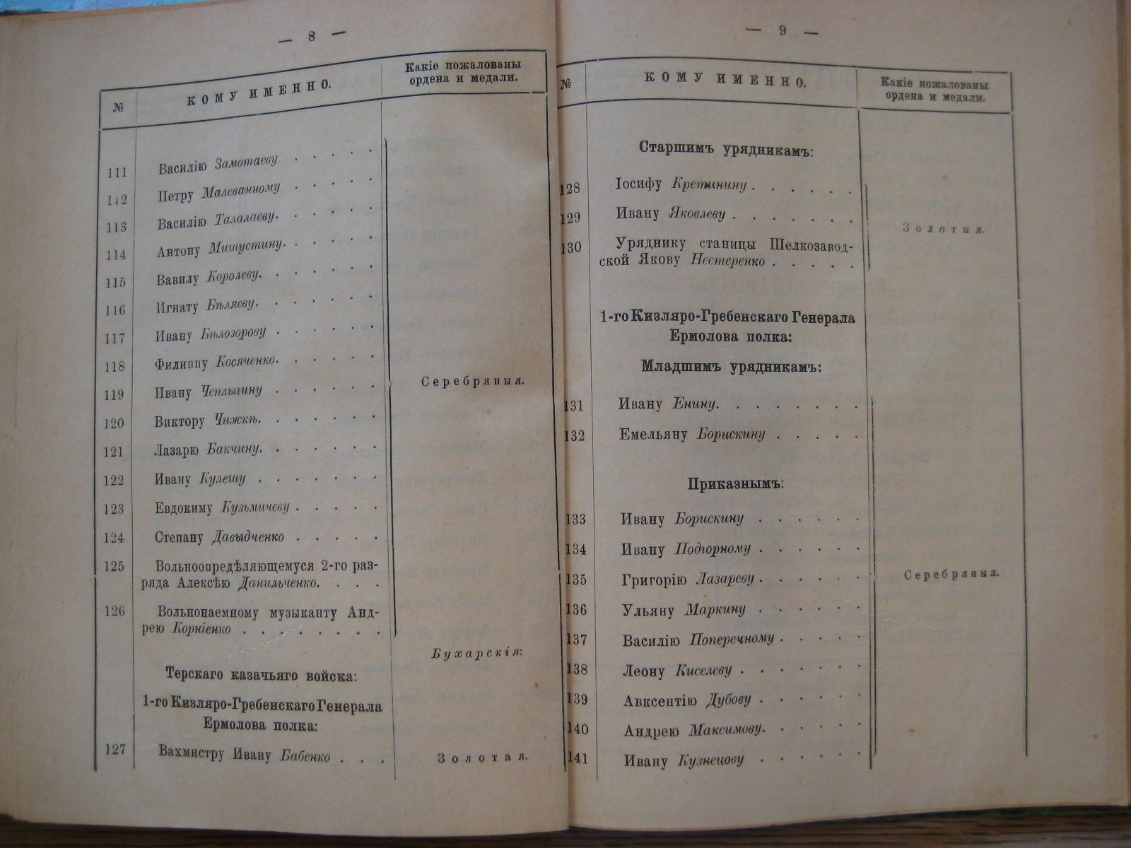 "При сем объявляю для сведения список казаков Терского Казачьего Войска, награжденных знаками отличия Военного ордена в войну с Японией и получившие подарки от Войска,, установленный приказом по Войску за № 203 1905 года..."