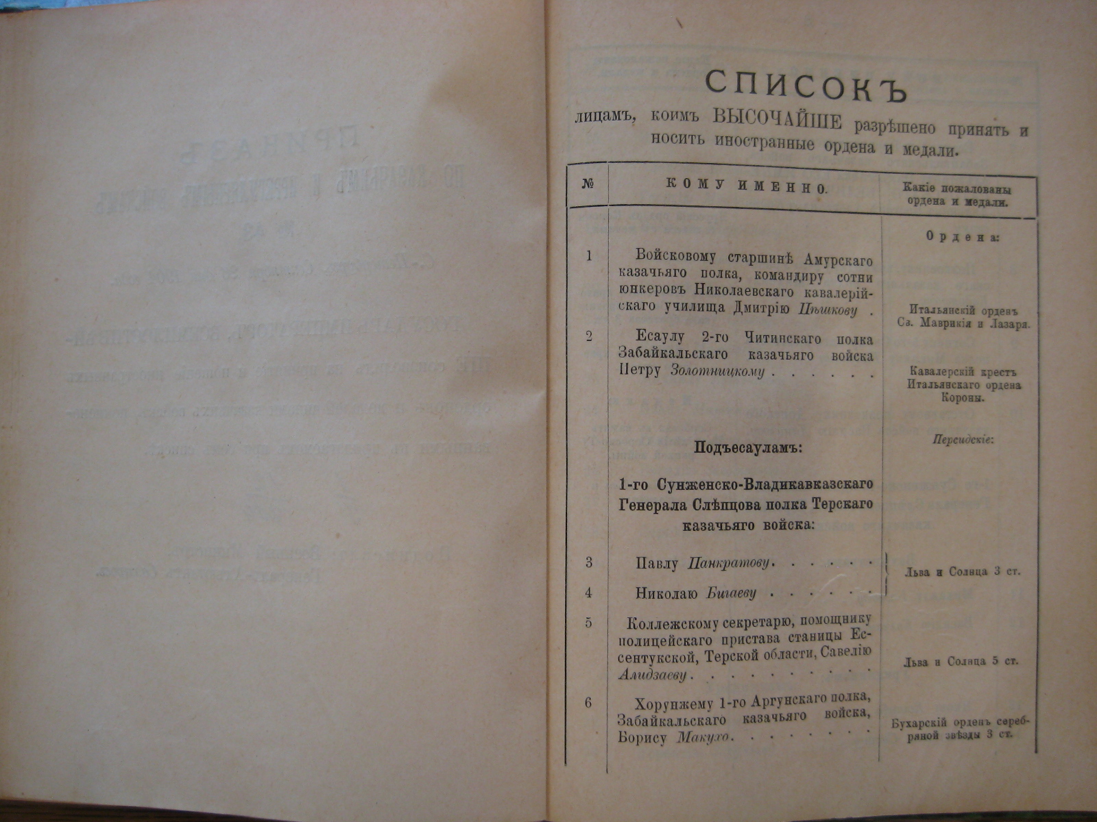 ГОСУДАРЬ ИМПЕРАТОР  ВСЕМИЛОСТЕВЕЙШЕ соизволил на принятие и ношение иностранных орденов и медалей казачьих войск , поименованным в прилагаемом при сем списке.