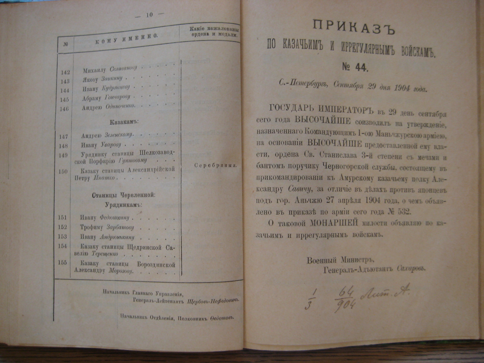 Источник: Приказ по Казачьим  и Иррегулярным  войскам № 43 от 26 сентября 1904 года. Санкт- Петербург.