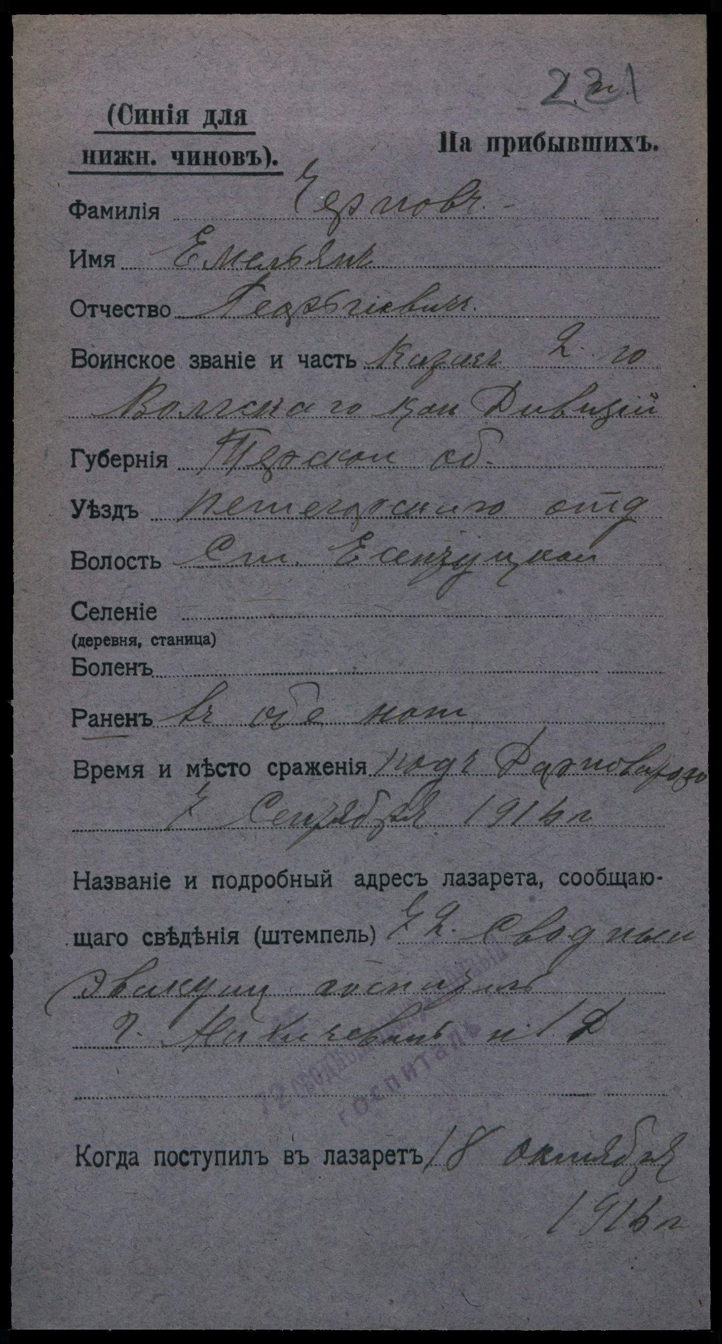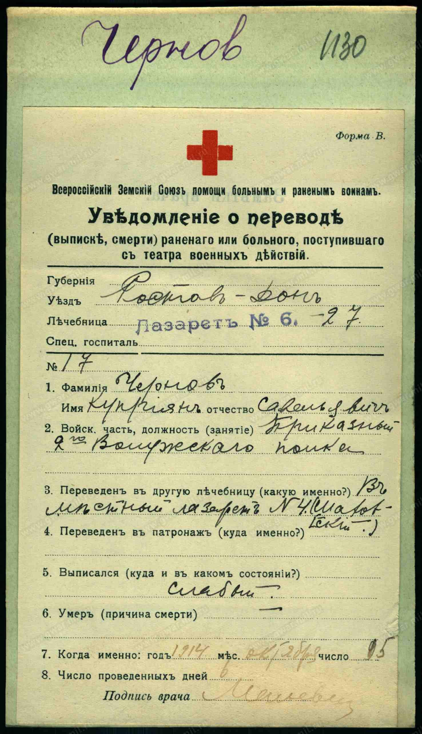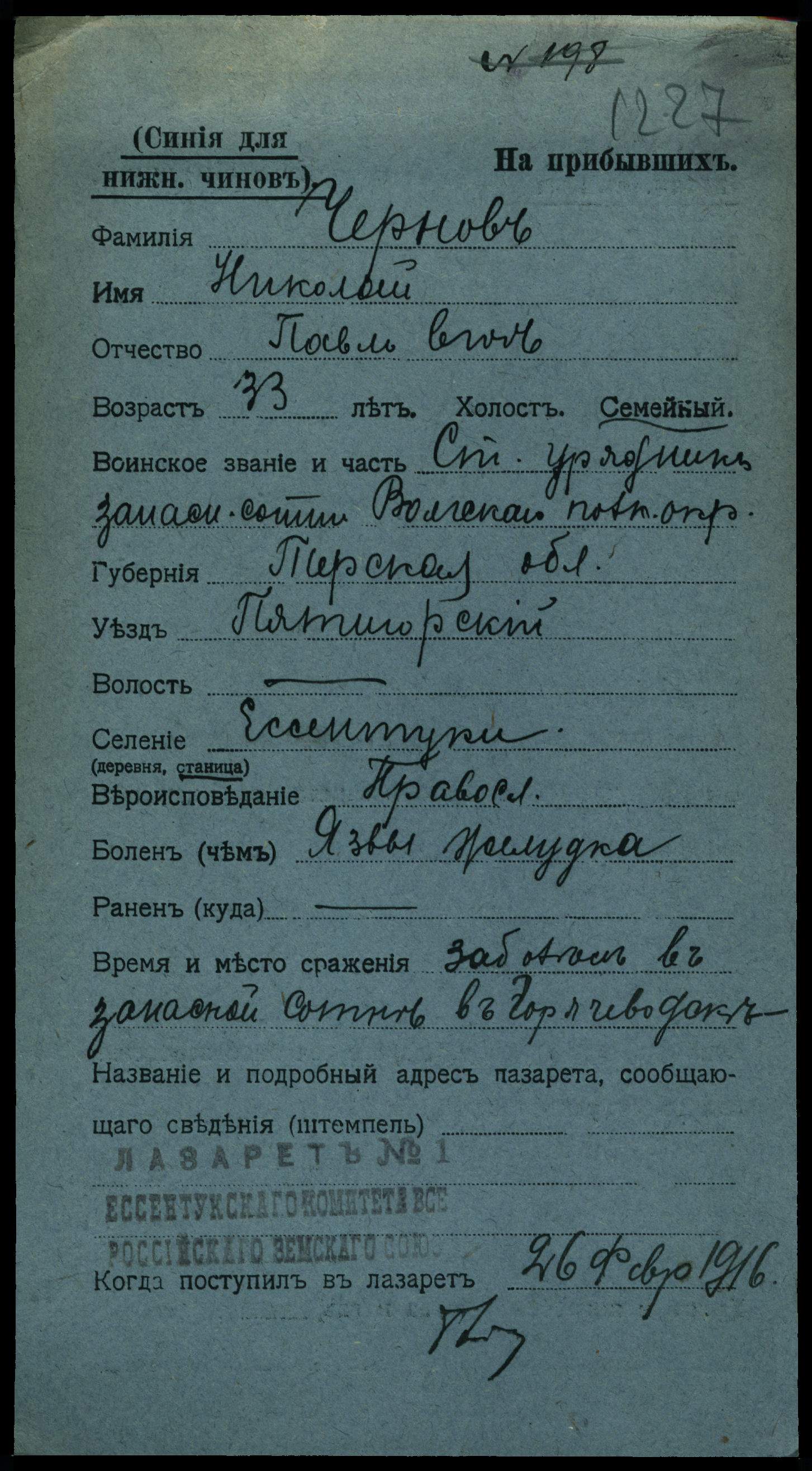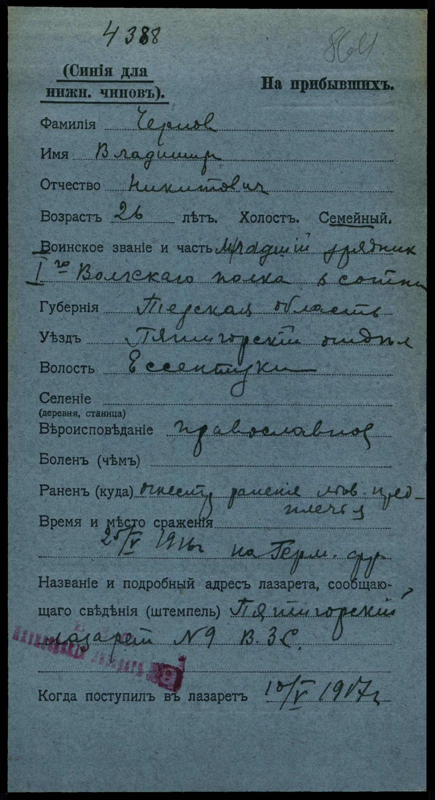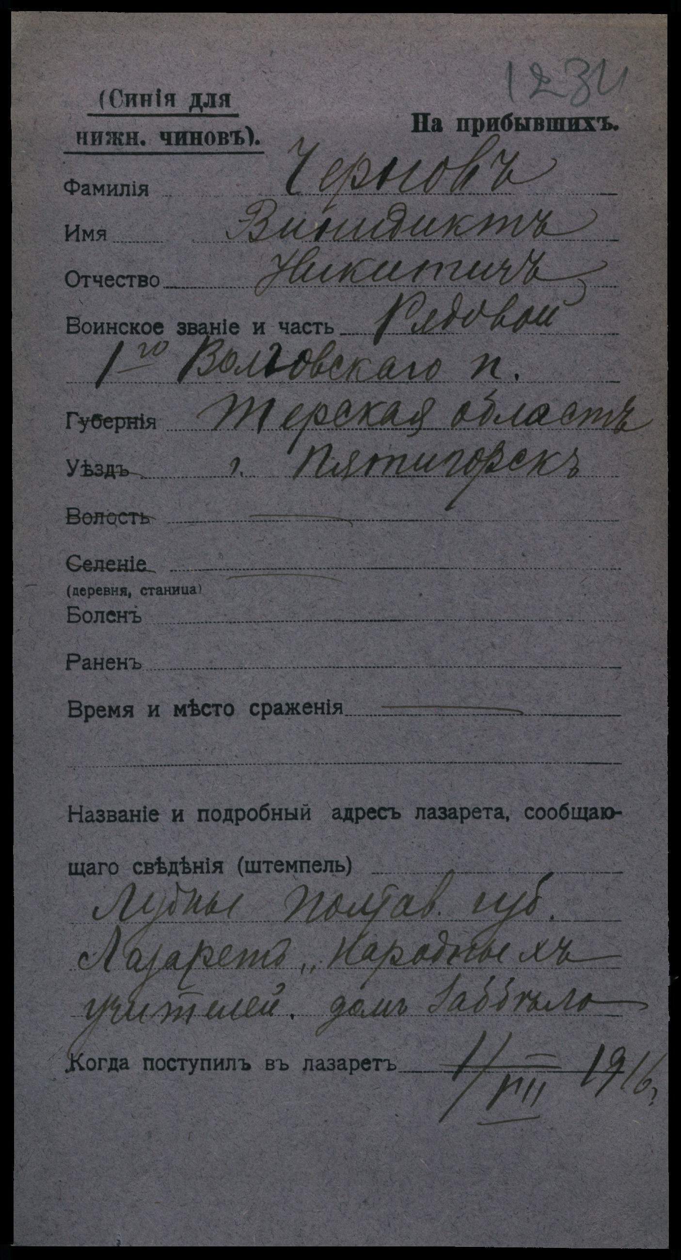 Рядовой __.__.1907 г. Ессентуки, ул. Максима Горького, д. 60 , Место службы: 1155 пп. Картотека
