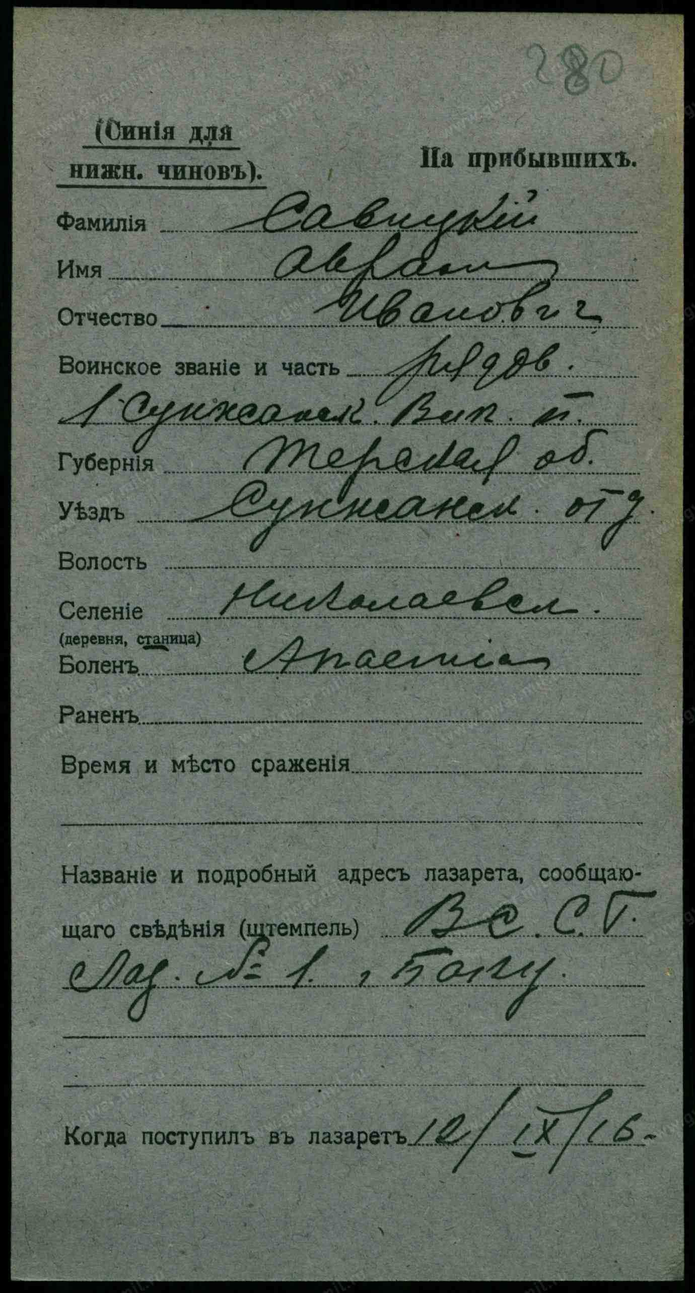 Место выбытия 192 полевой подвижной госпиталь, г. Станиславов