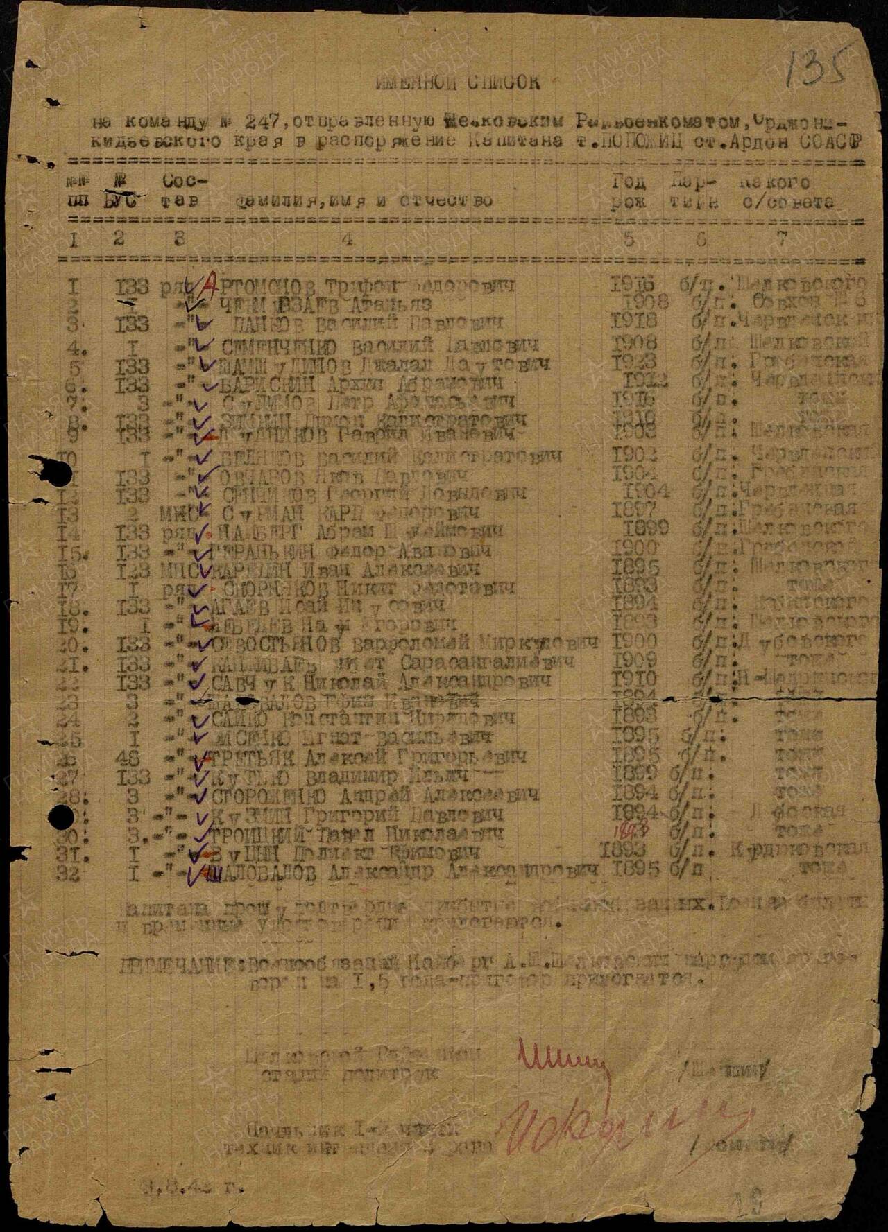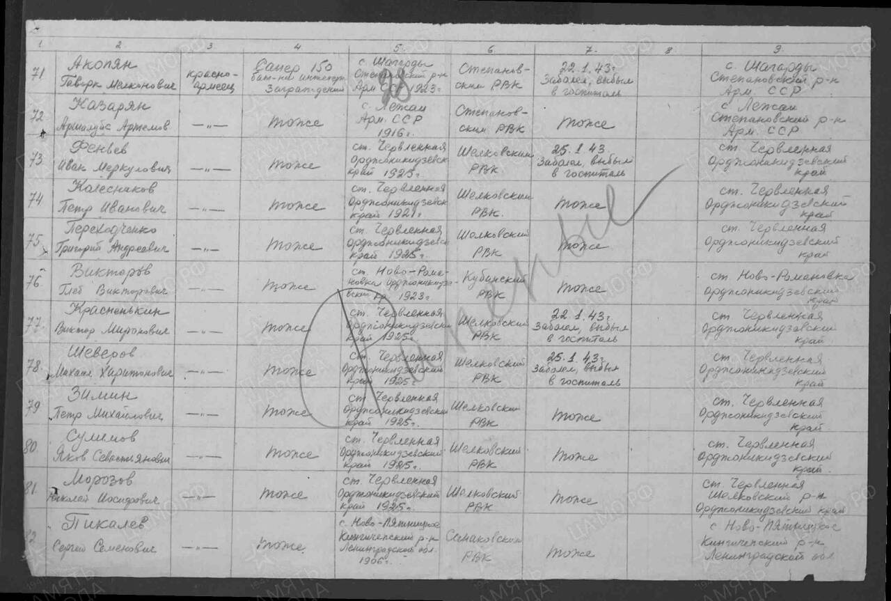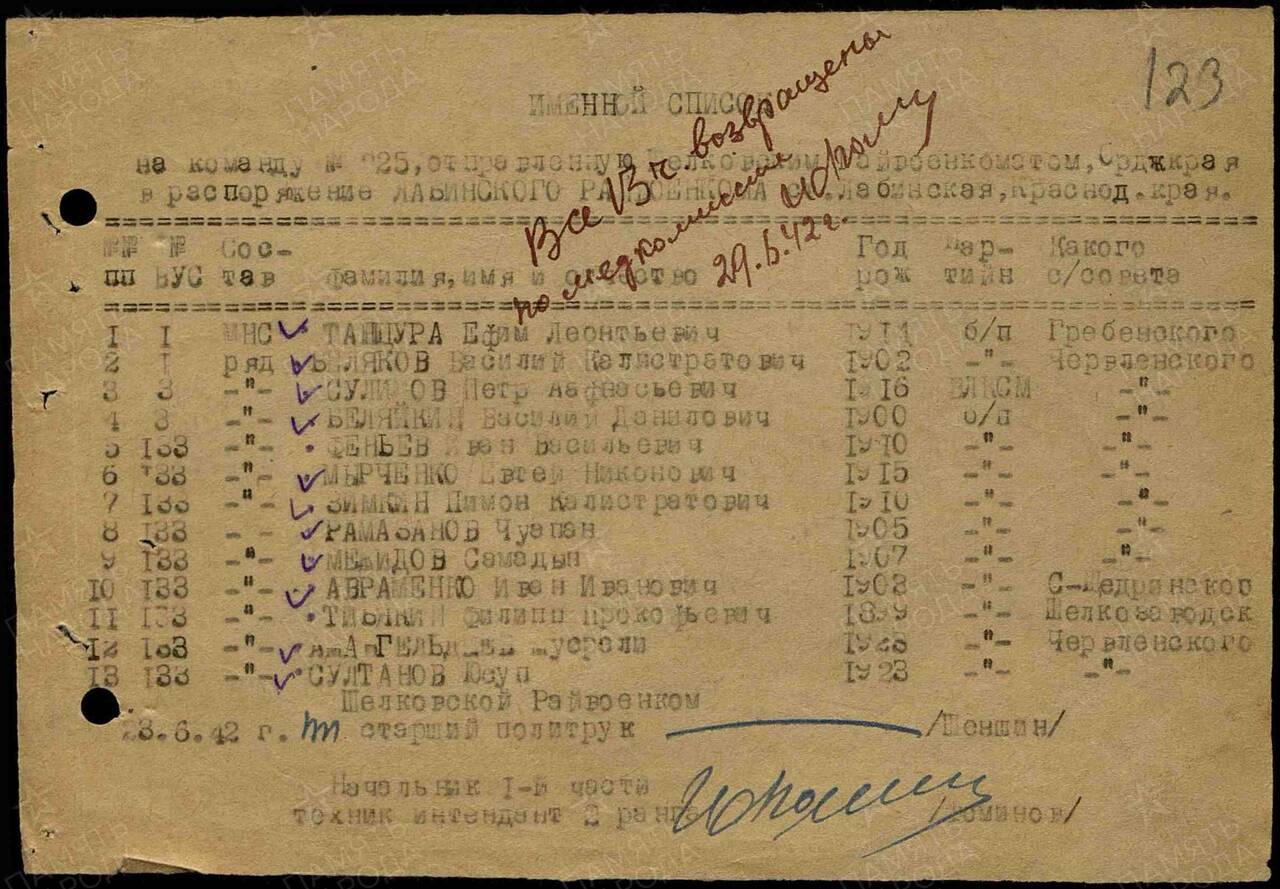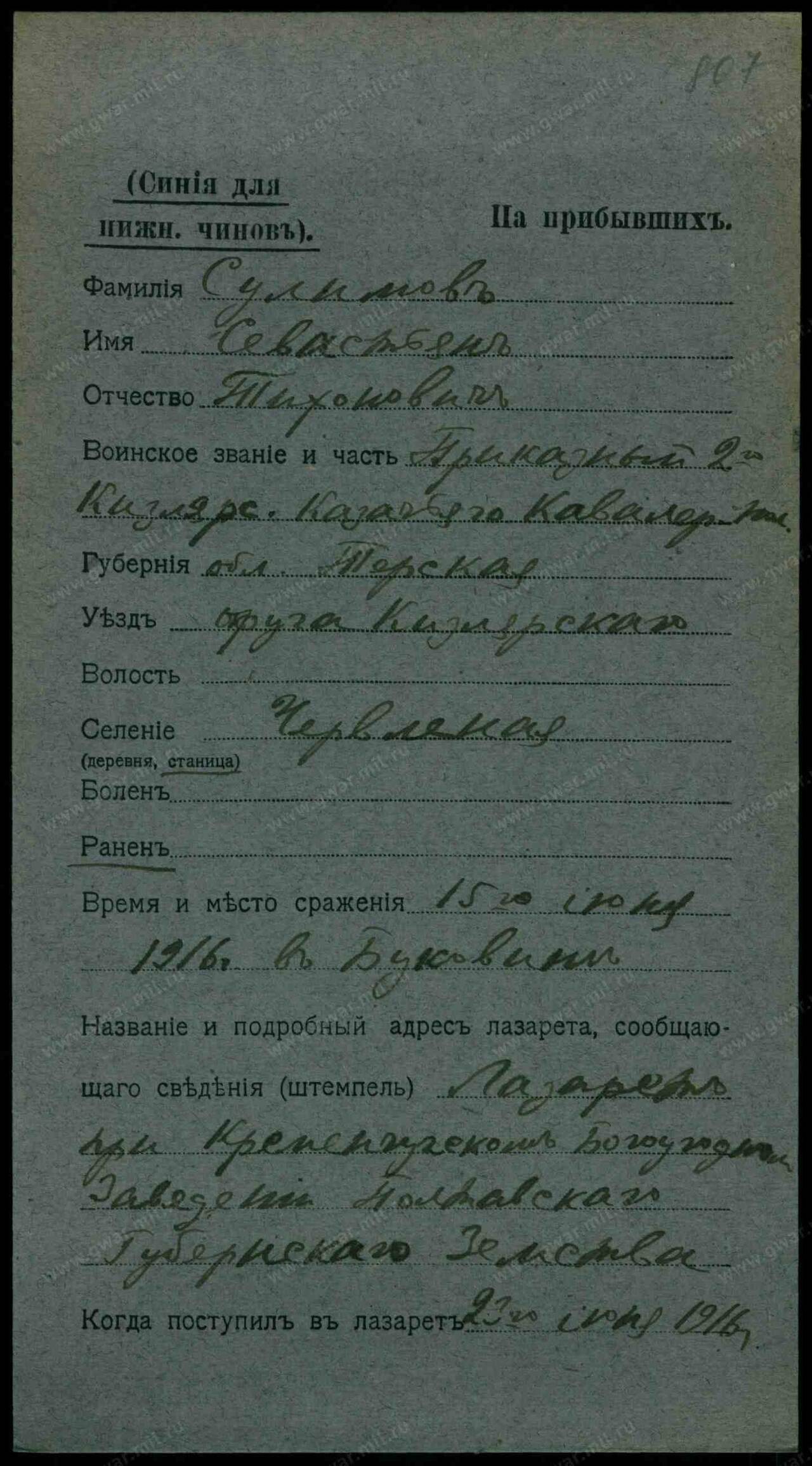 7. Сулимов Арефий Тиханов, племянник, 21 год, казак, родился здесь, на военной службе, отсутств., стар. закон. свящ., родной язык русский, неграмотный, казак.