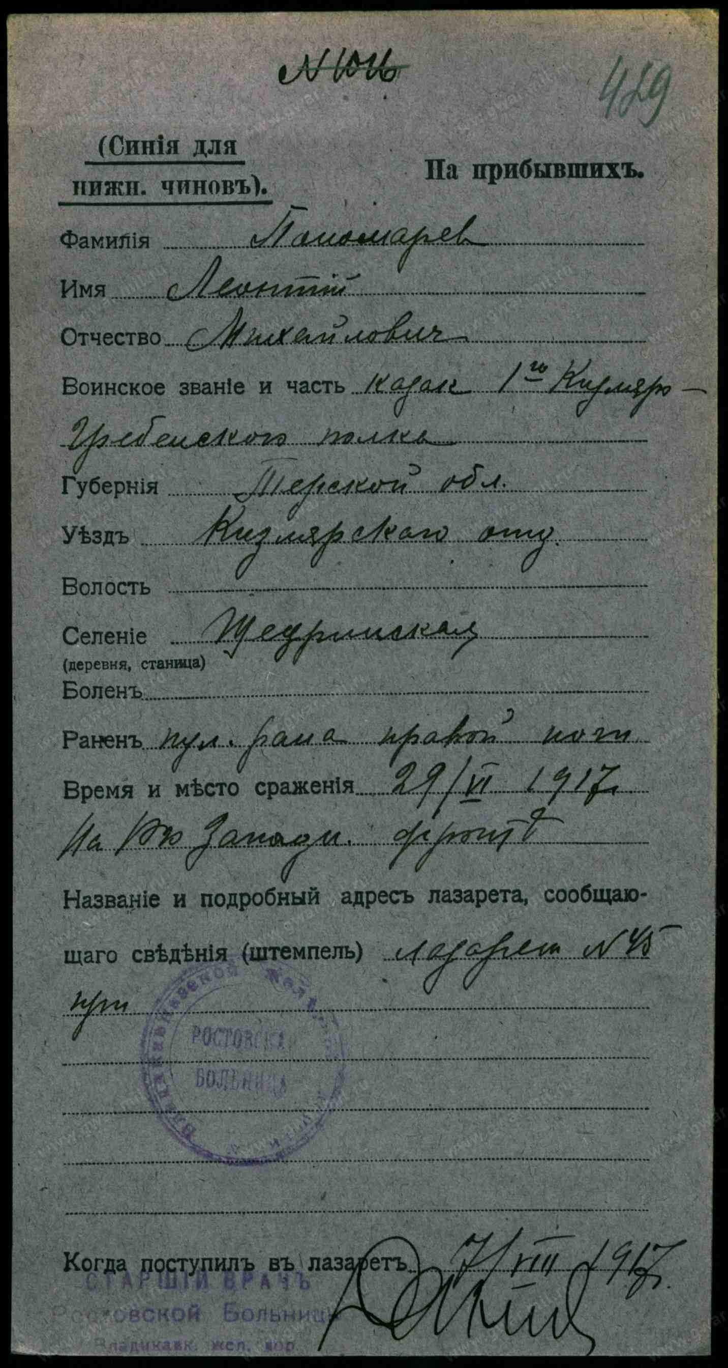1. Пономарев Николай Сергеев, хозяин, 26 лет, казак, родился здесь, стар., родной язык русский, грамотный, в сельском нач. уч. М.Н.П., винодел, земледелие, терский льг. казак.