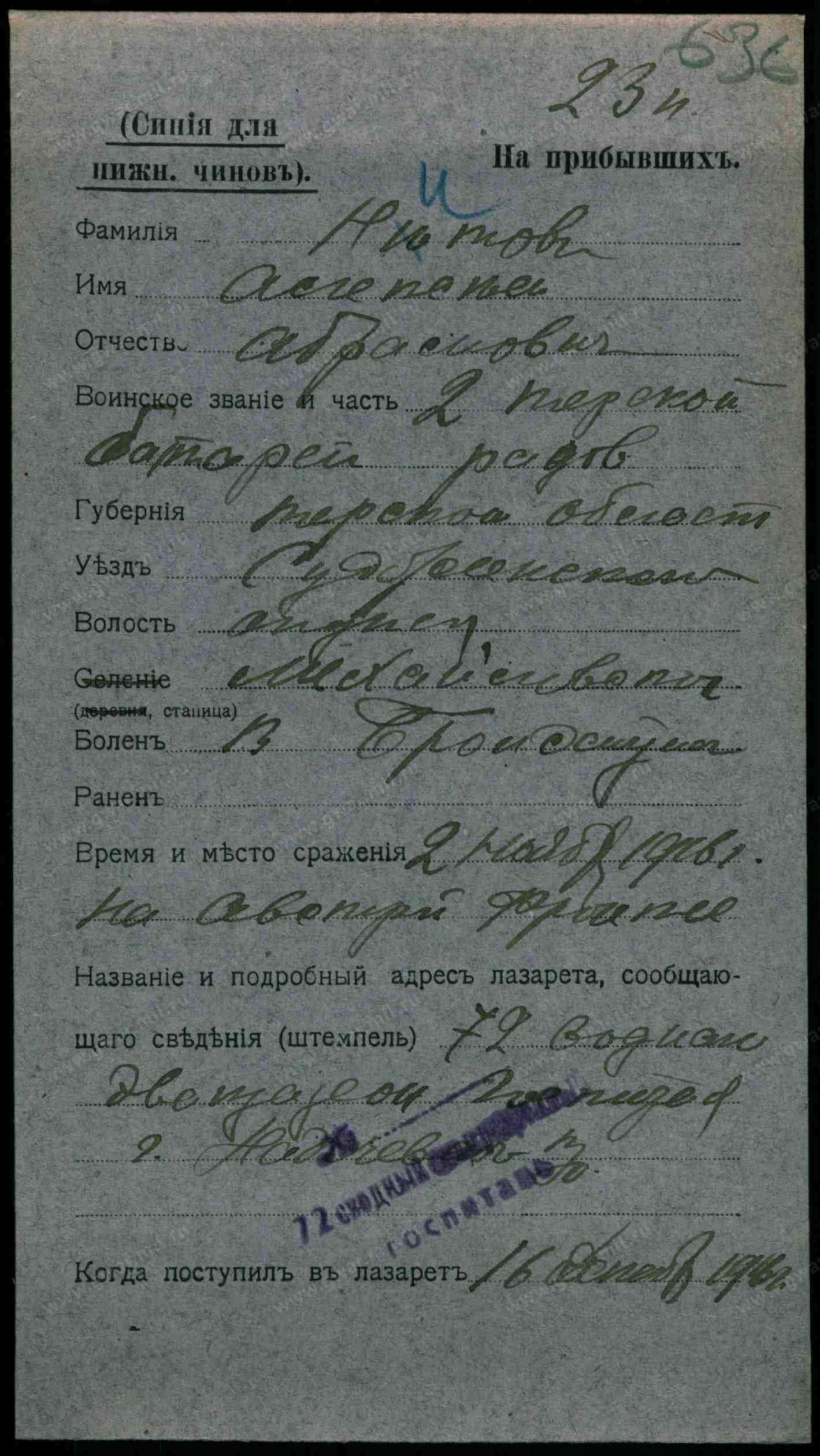 Тип документа Карточка на прибывших (нижние чины)