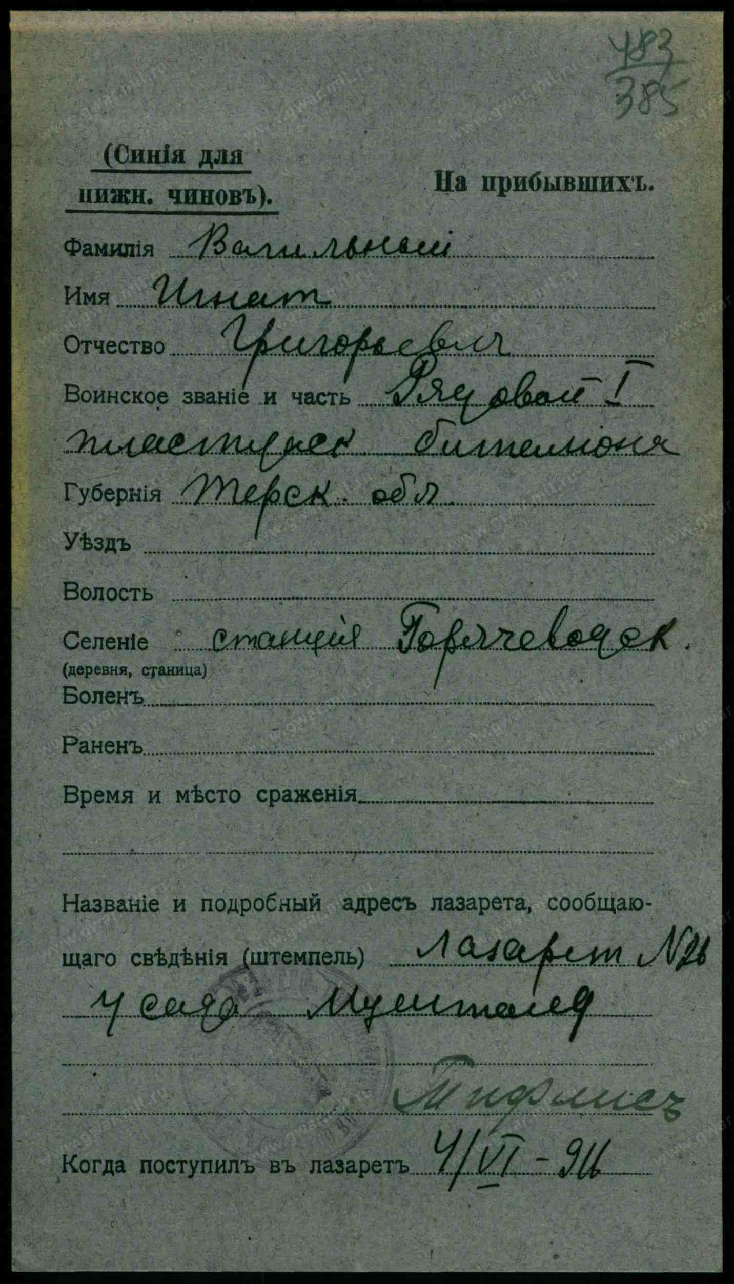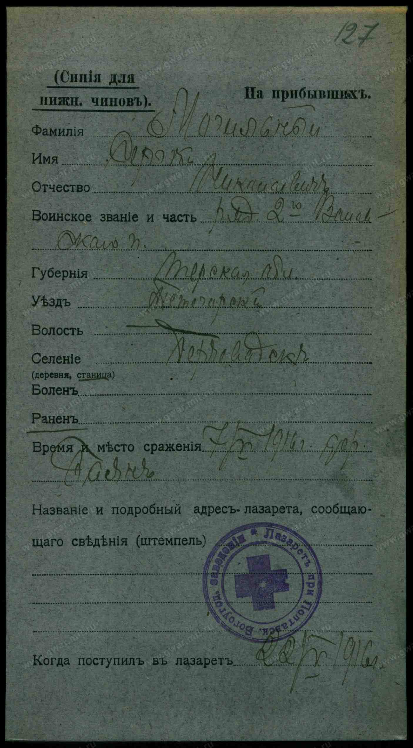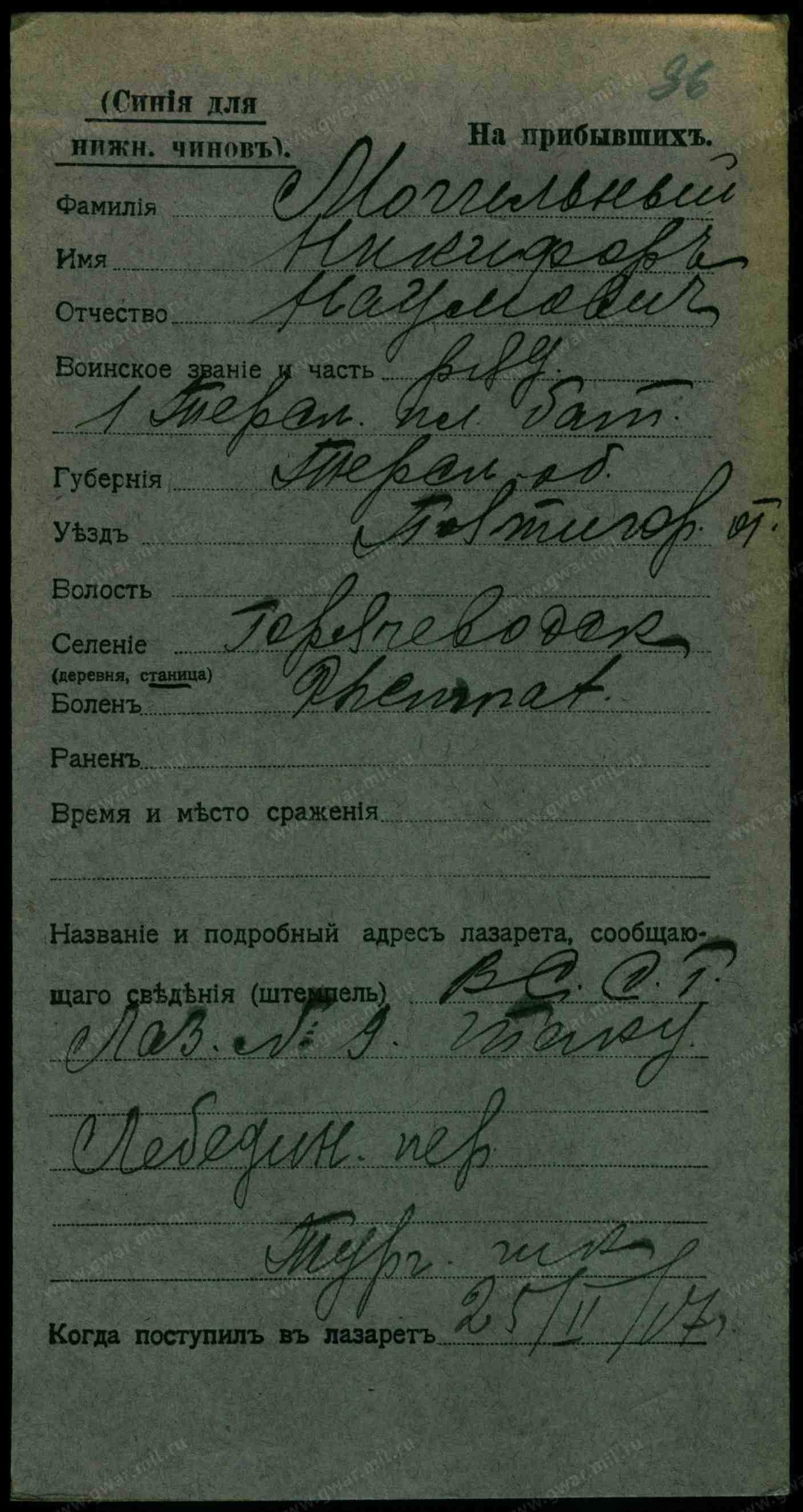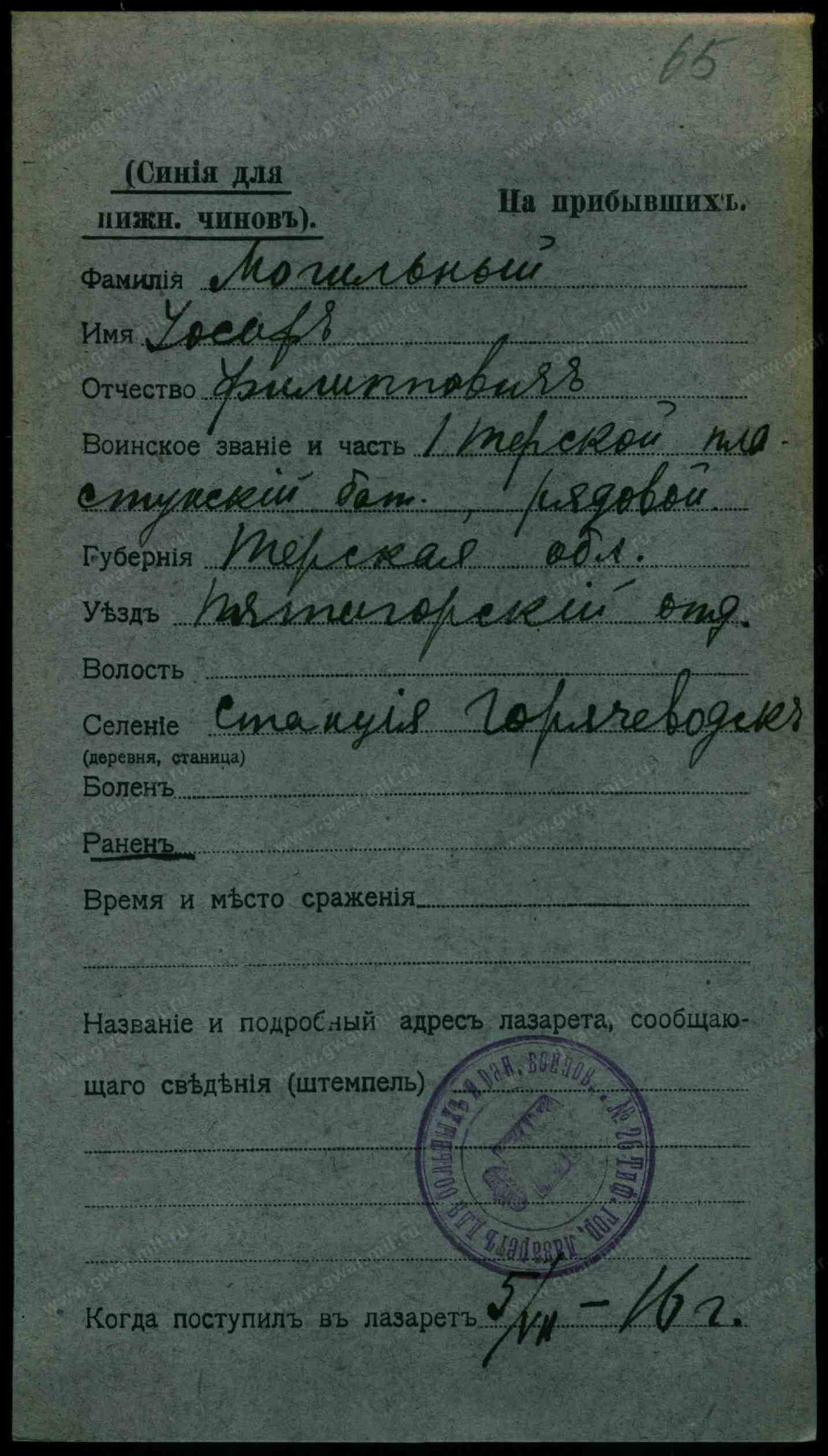 Гв. красноармеец, 1914, Орджоникидзевский край, г. Пятигорск, ст. Горячеводск, Советская, 79, Место службы: 56 А 10 гсб, Пятигорский ГВК, Орджоникидзевский край, г. Пятигорск. Донесение о потерях