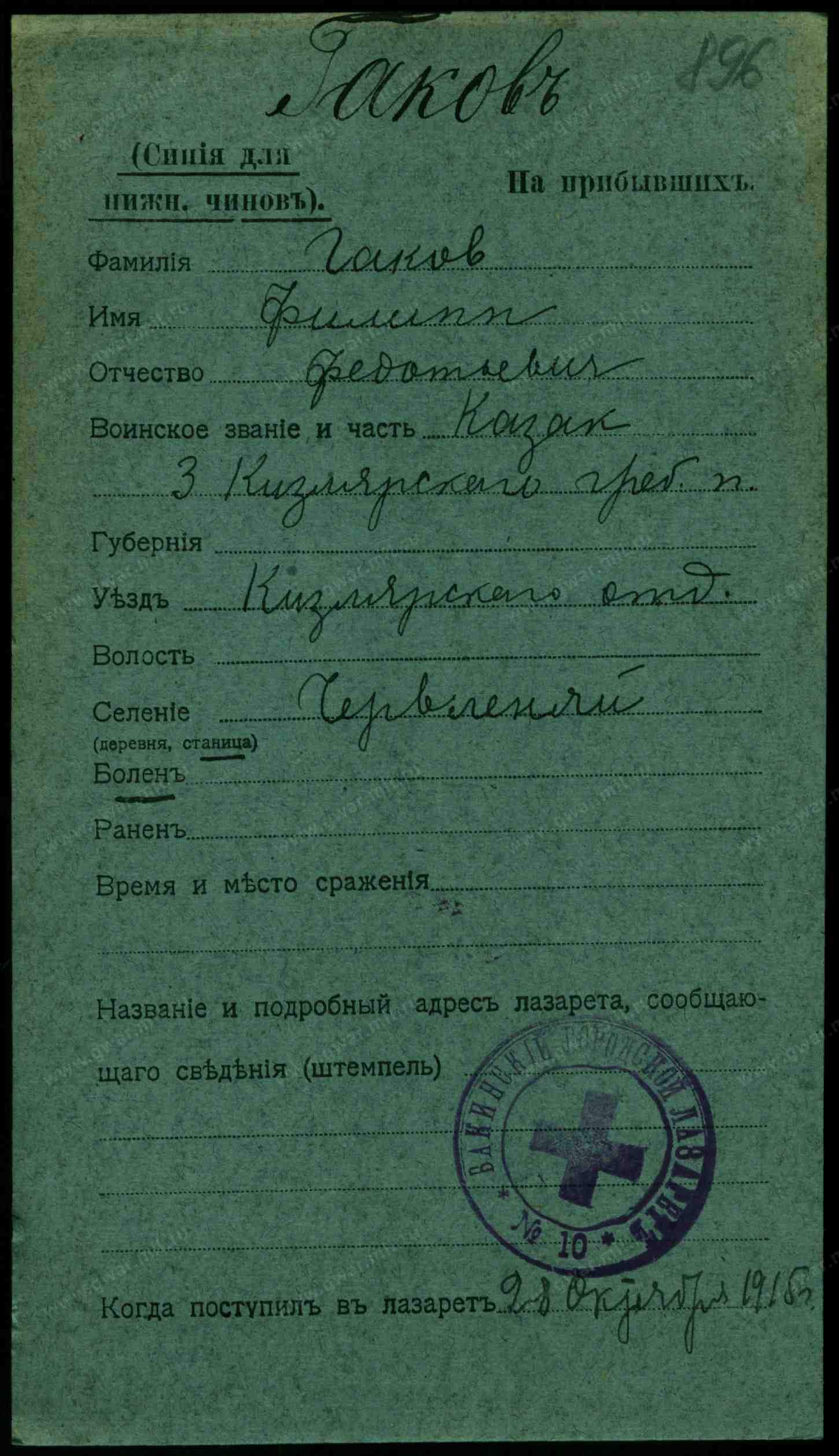 1. Гаков Зиновий Николаев, хозяин, 24 года, казак, родился здесь, на военной службе, отсутств., стар. закон. свящ., родной язык русский, грамотный, в одноклас. ст. школе, казак.