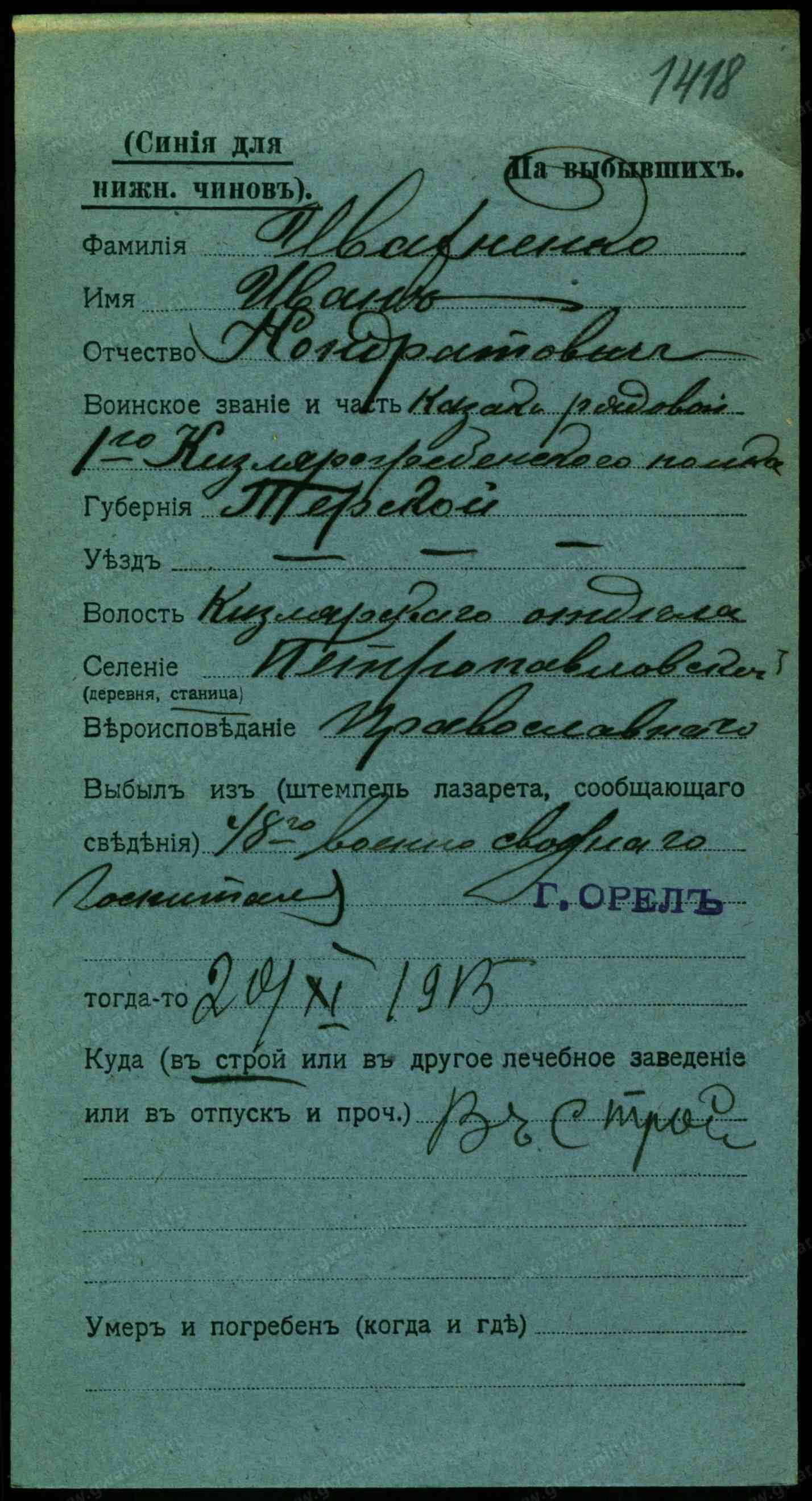 3. Ивахненко Кондратий Трофимович, сын, 32 года, казак, родился здесь, прав., родной язык малороссийский, грамотный, в стан. 1 клас. учил. МНП, земледелец при отце, Терский льготный казак.