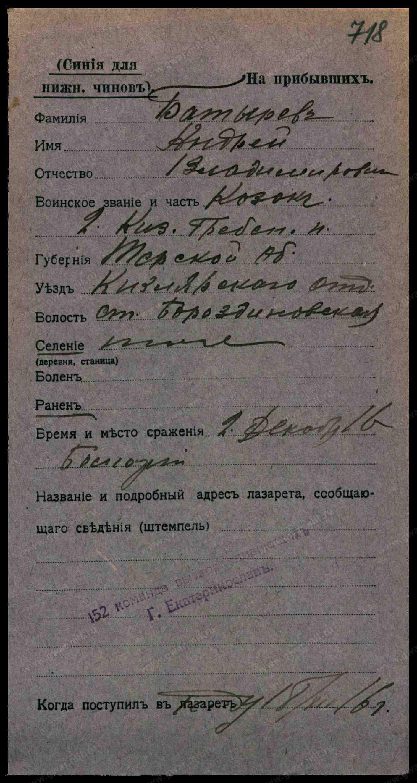 Место рождения Терская обл., Кизлярский округ (отдел), Бороздиновская вол., стнц. Бороздинская