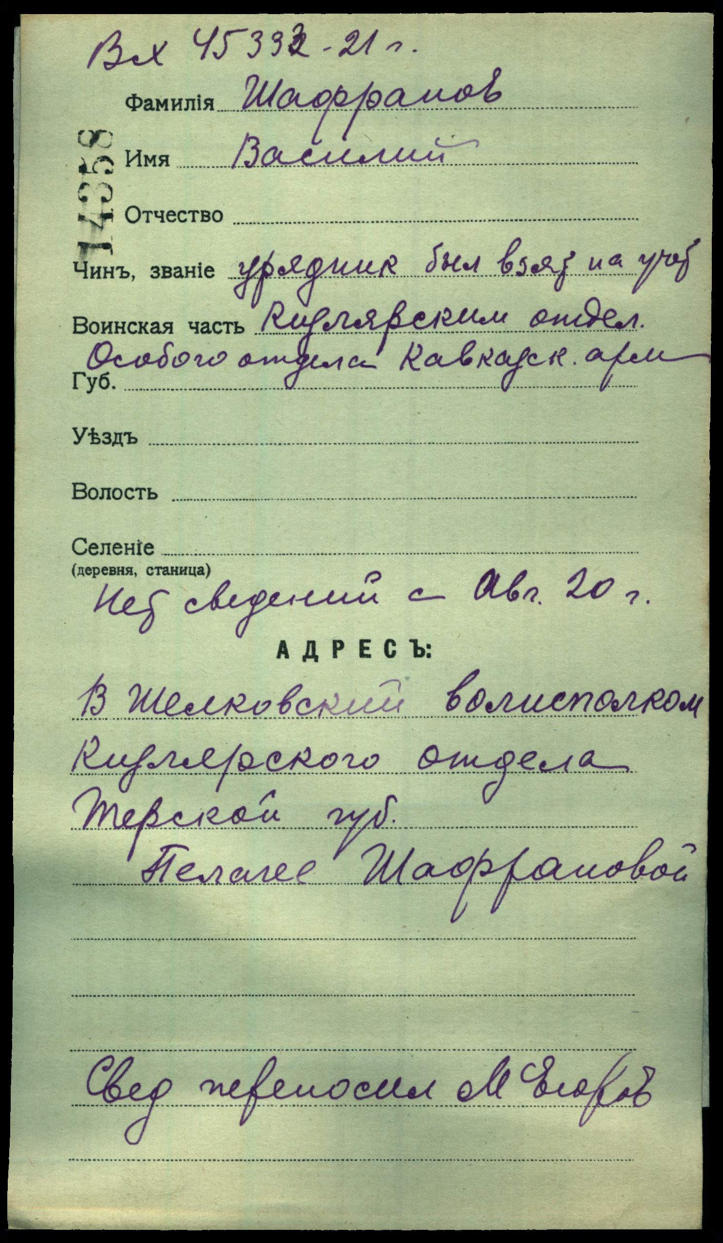 Место рождения Терская обл., Кизлярский отдел, Шелкозаводское сельское правление