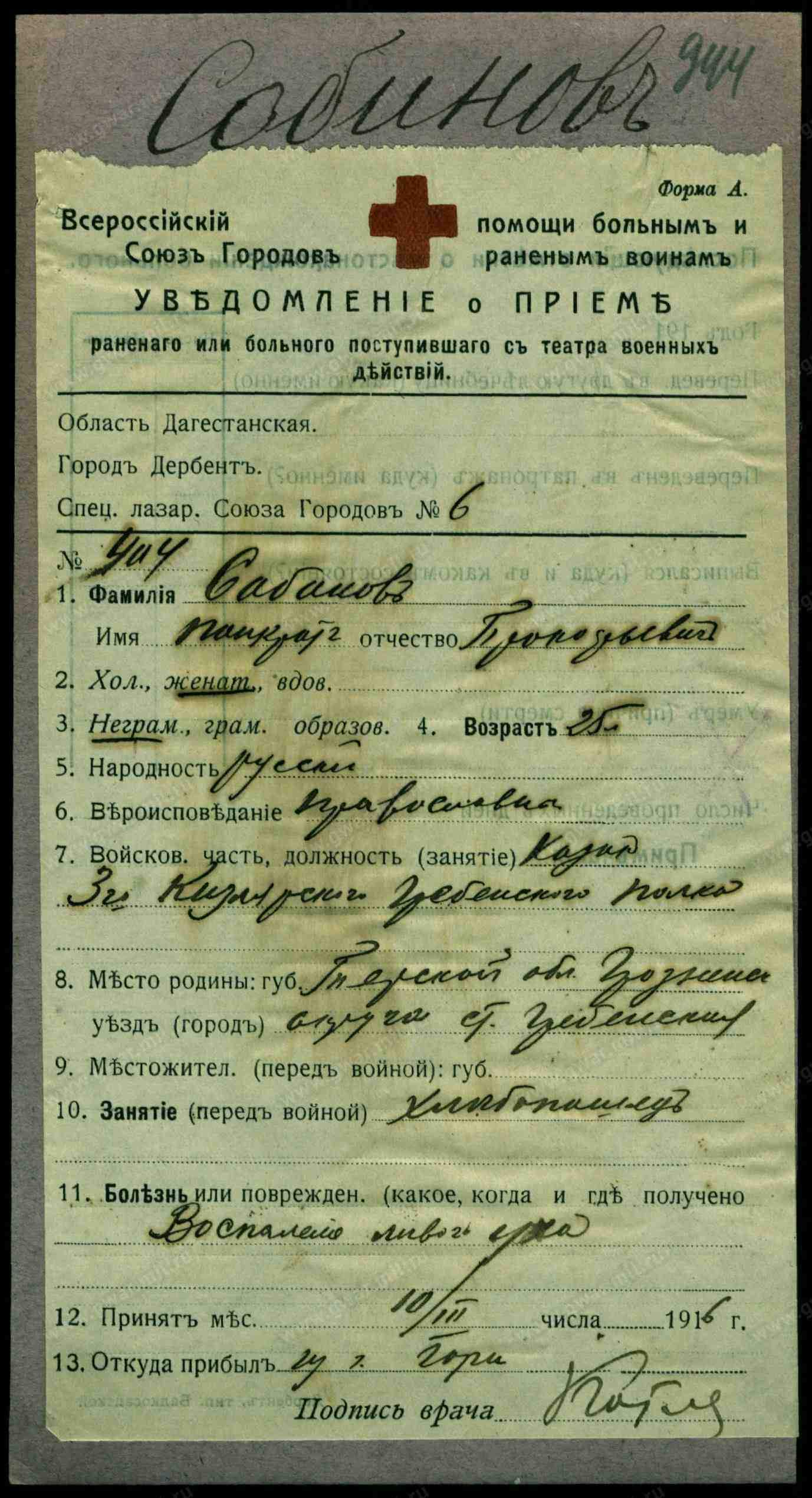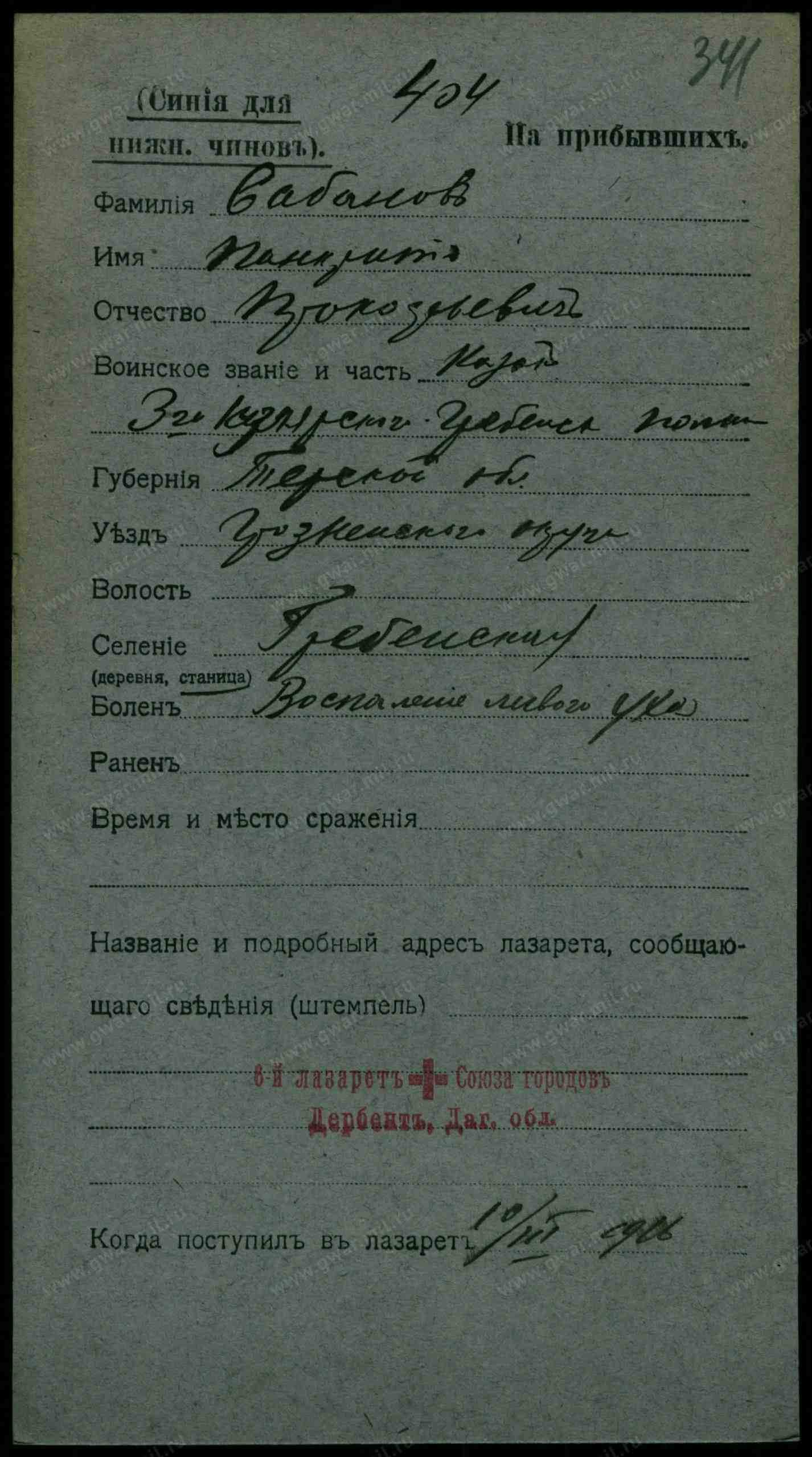 7. Сабанов Никифор Фролов, гость, 21 год, казак, родился в Терской обл., Кизлярском отд., ст. Новогладковская, приписан в Терской обл., Кизлярском отд., ст., Новогладковская, обыкновенно проживает в Терской обл. ст. Новогладковской, стар., родной язык русский, грамотный, в сел. нач. учил. М.Н.П., виноделие при брате.