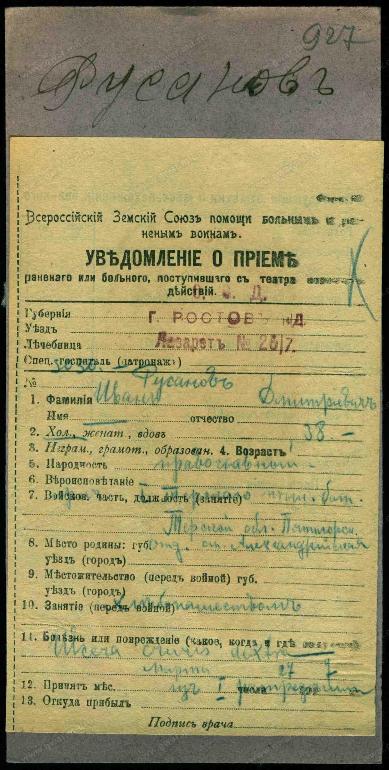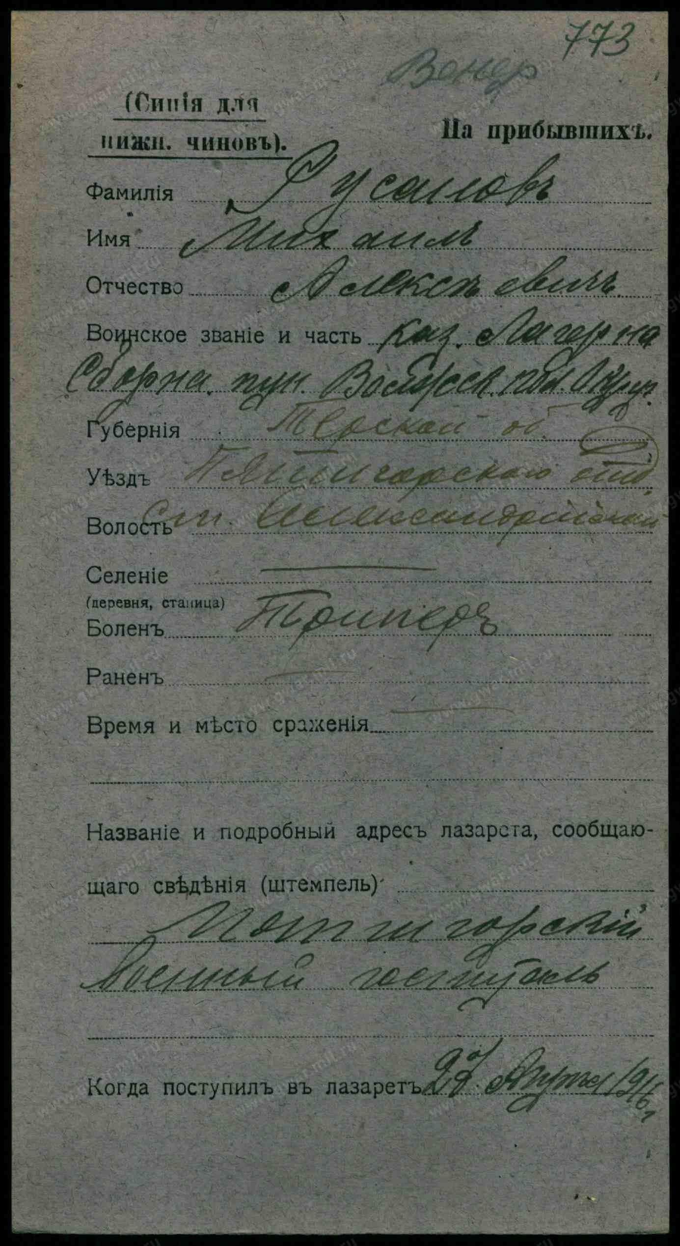 Тип документа: Карточка на прибывших (нижние чины).