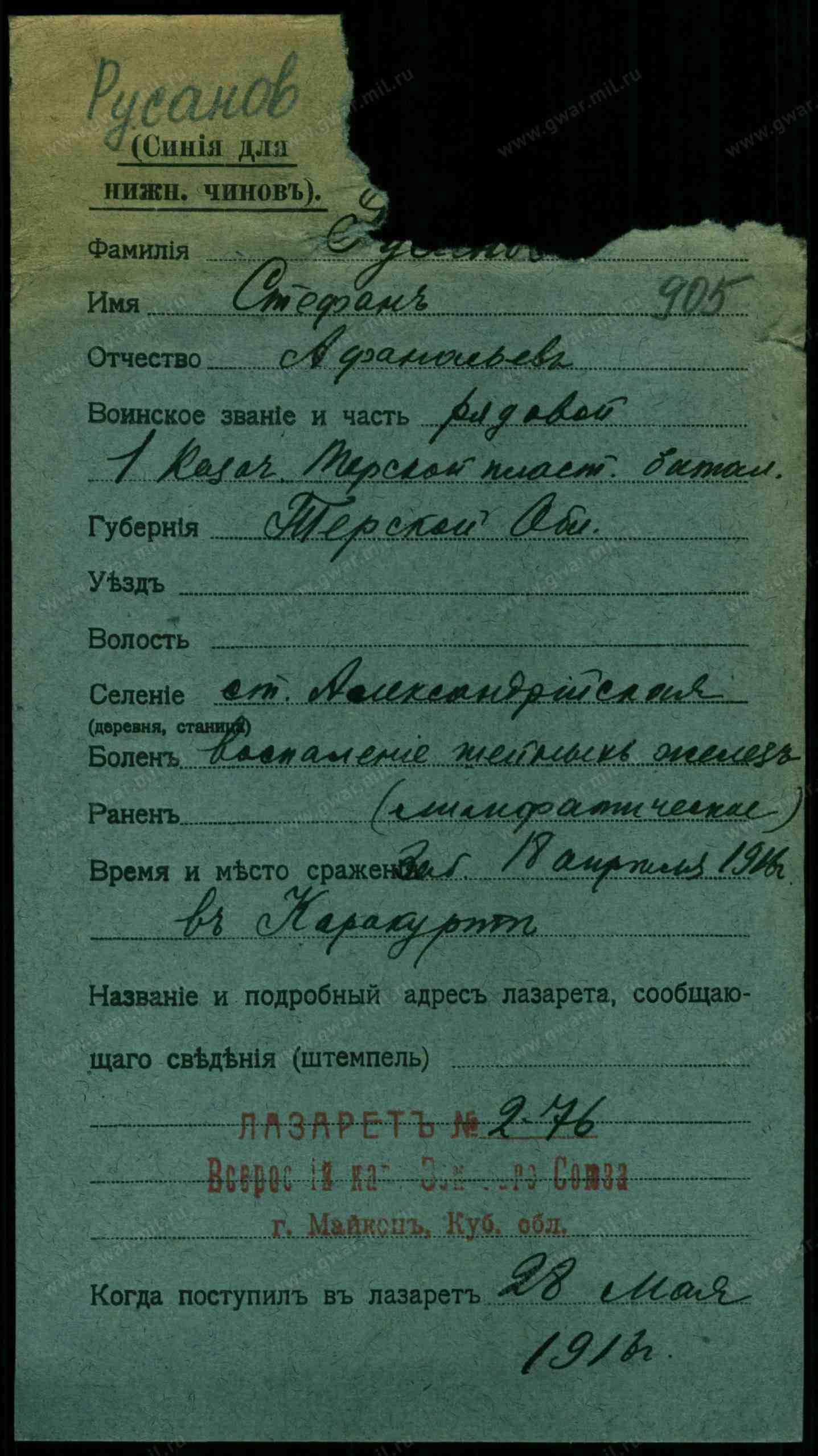 Воинская часть: 1-й казачий Терский пластунский батальон.