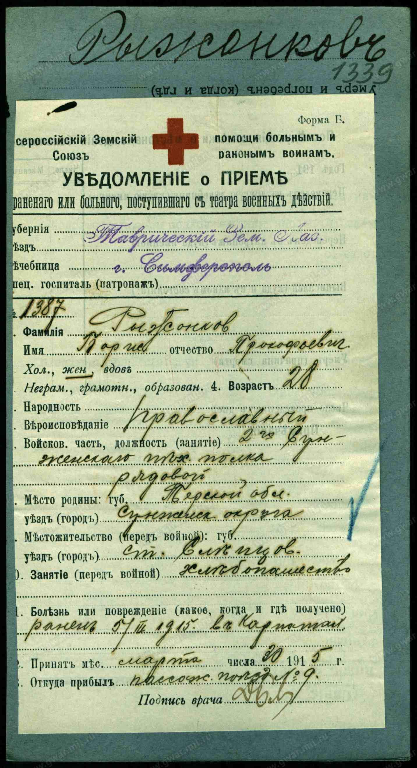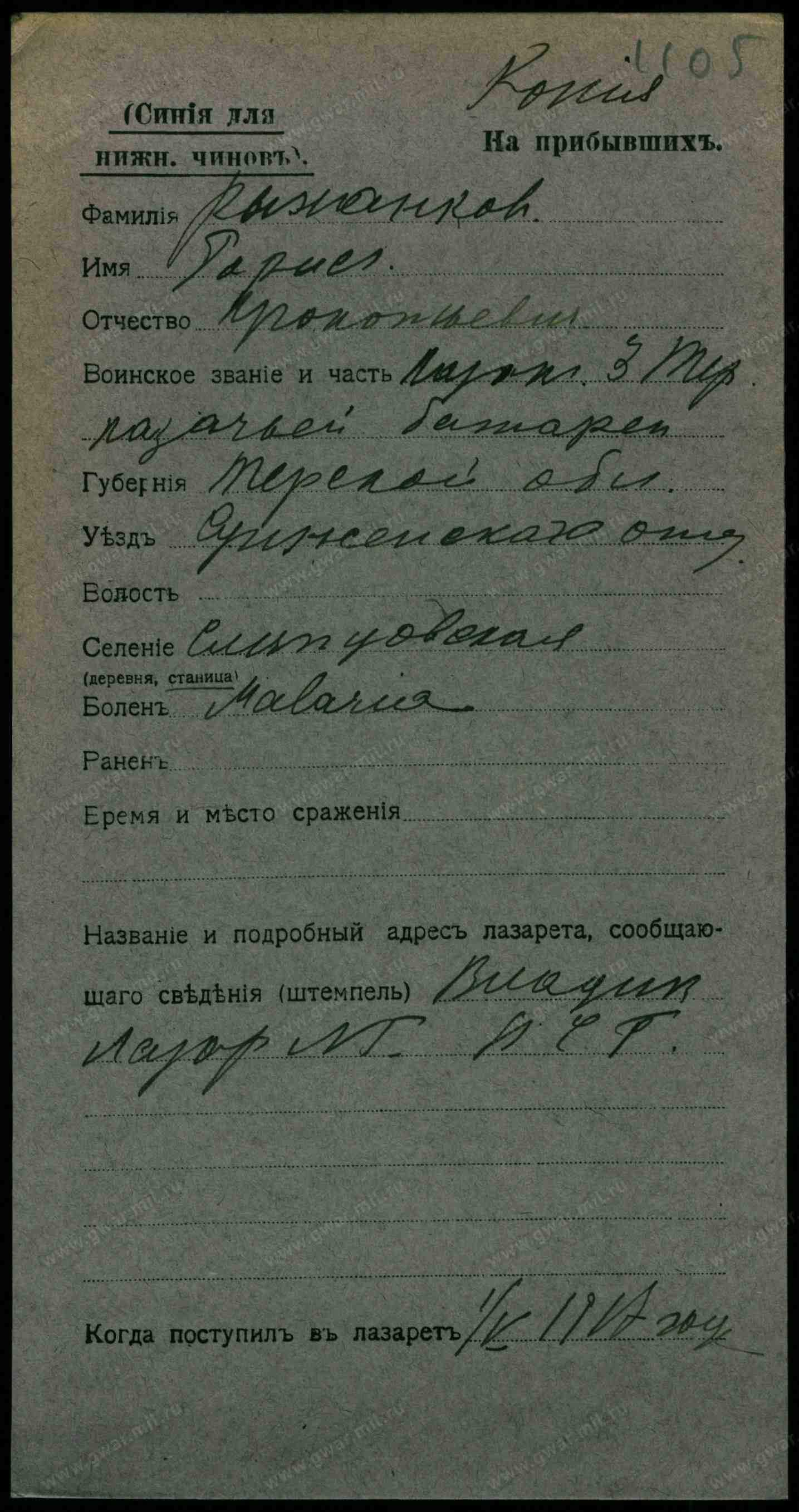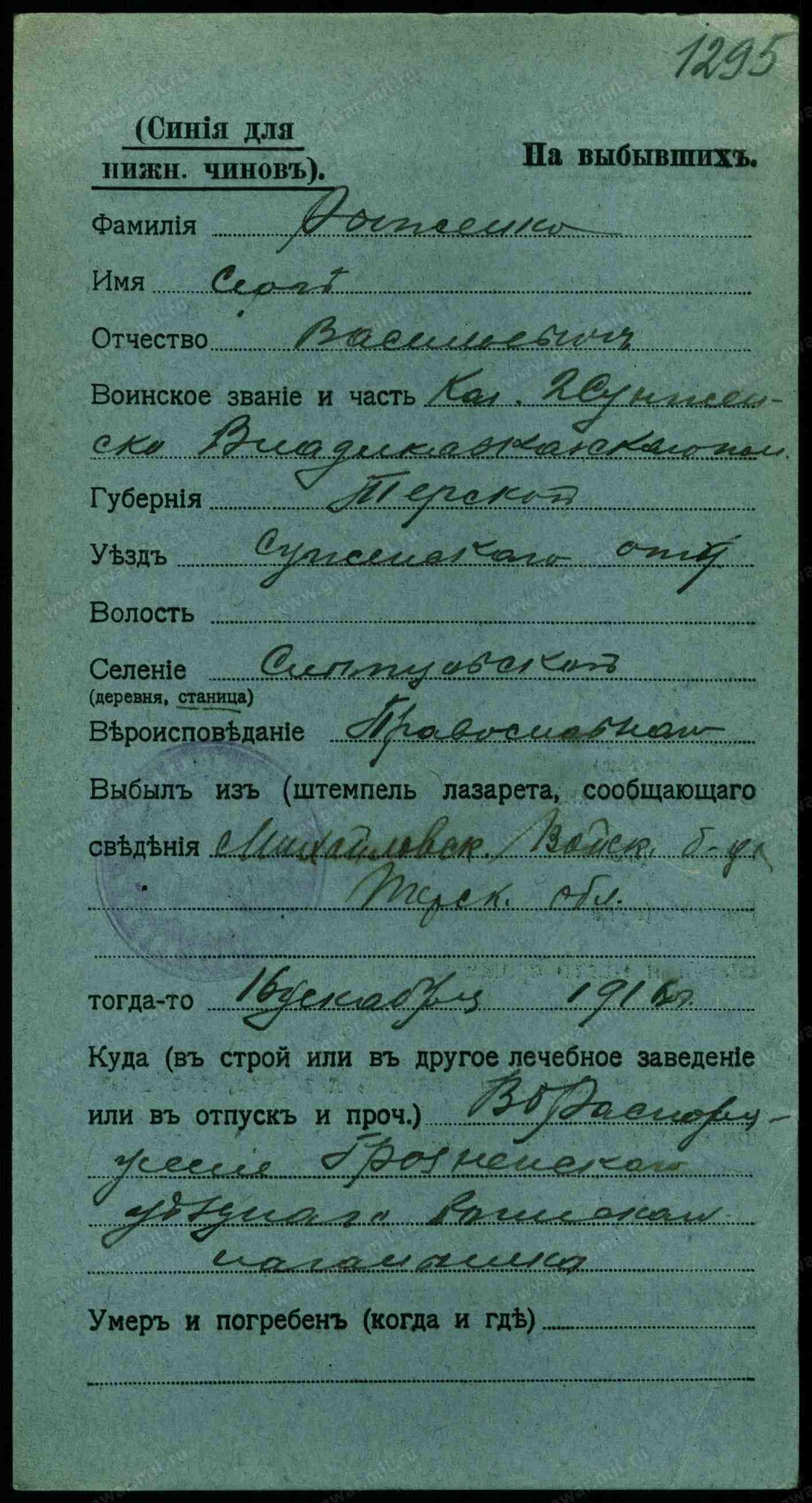 Место выбытия под Жевачев; госпиталь, г. Станиславов