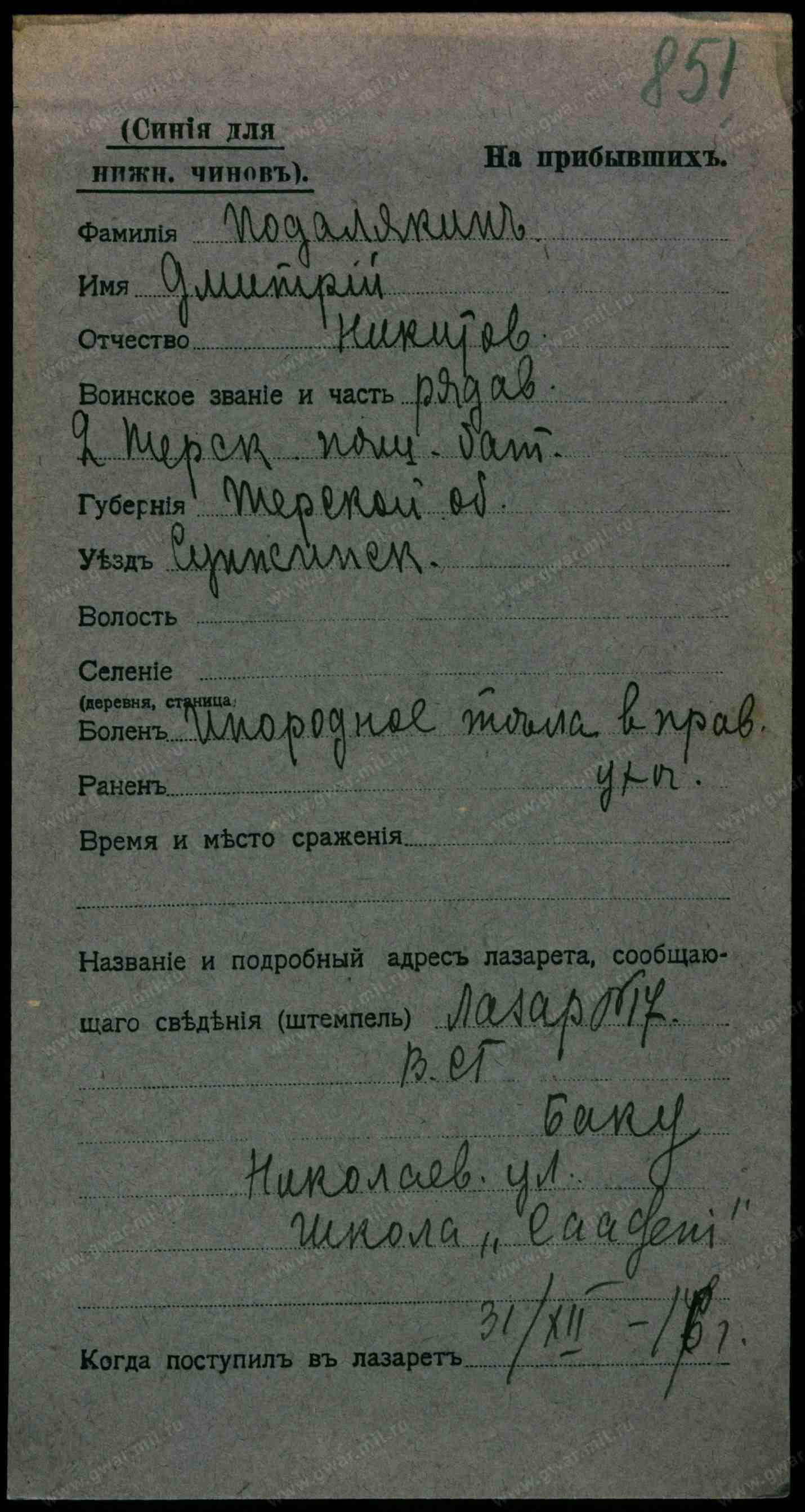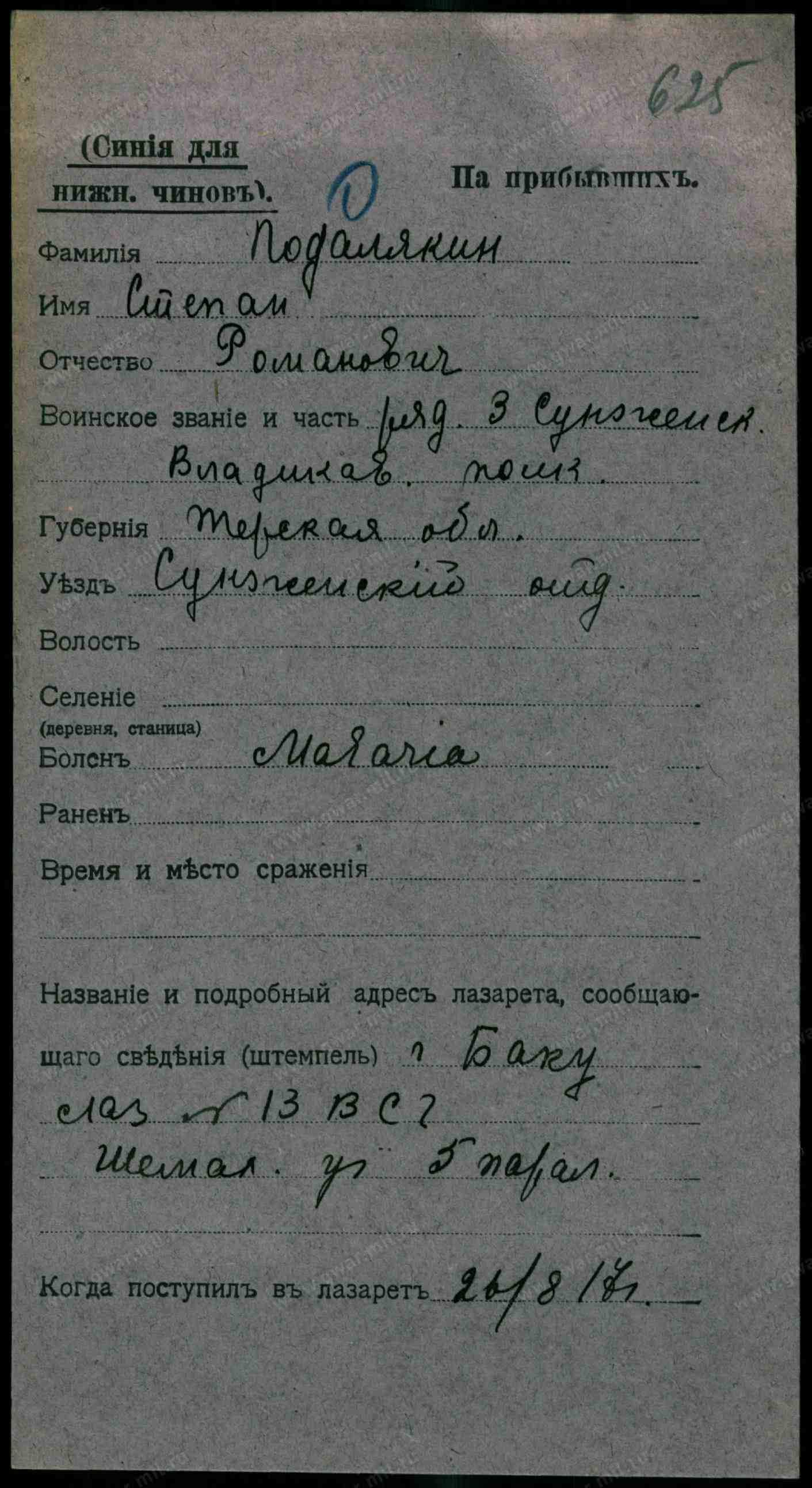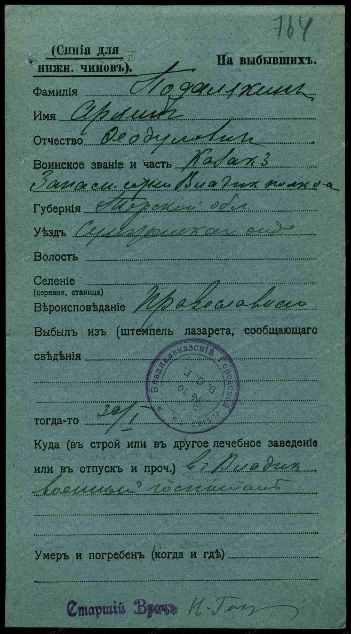 Подалякин Михаил Феодулович, р. 5 сен. 1893. Из казаков Терской обл. В службе с 1915. Горийская школа прапорщиков 20 авг. 1917. Прапорщик 2-го Сунженско-Владикавказского полка Терского казачьего войска. В Вооруженных Силах Юга России; с 8 мар. 1919 в 1-м Сунженско-Владикавказском полку. /532/