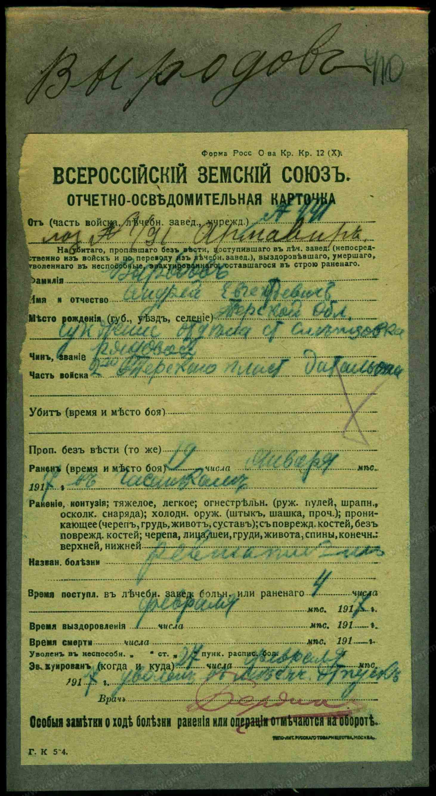Рядовой, __.__.1895 Грозненская обл., Сунженский р-н, ст. Орджоникидзе. Донесение о потерях