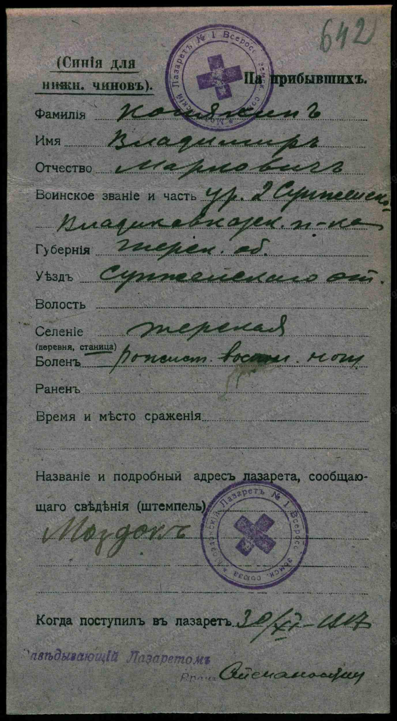 по женихе: Владикавказский мещанин Александр Феодоров Кондратенко и казак станицы Тарской Владимир Марков Коняхин.