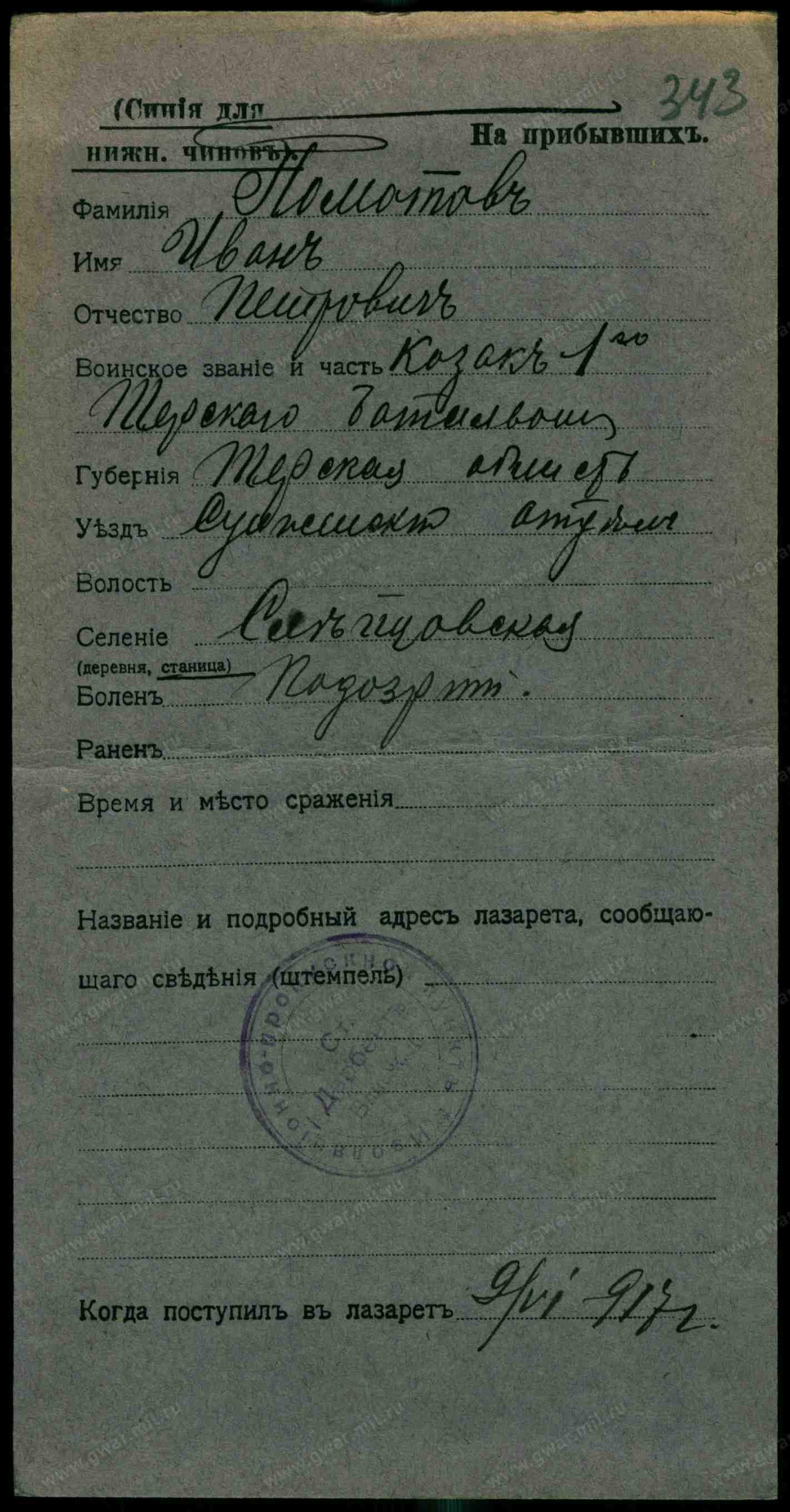 Тип документа Карточка на прибывших (нижние чины)