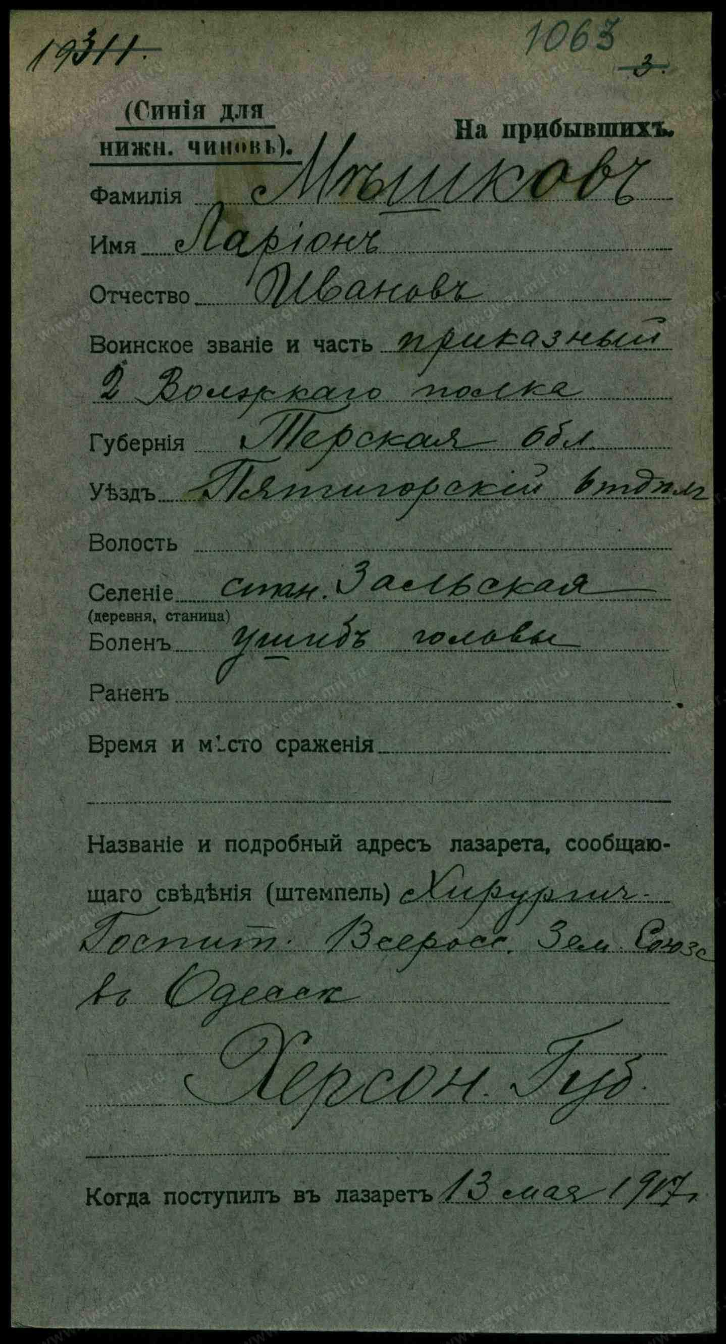 Командующий армией, согласно ходатайства моего и на основании 10 пункта приказа по военному ведомству 1869 года за № 144 изволил разрешить: отставного унтер-офицера Ивана Мешкова, зачислить с семейством и потомством в войсковое сословие Терского казачьего войска, с водворением на жительство в станице Зольской, Пятигорского округа.