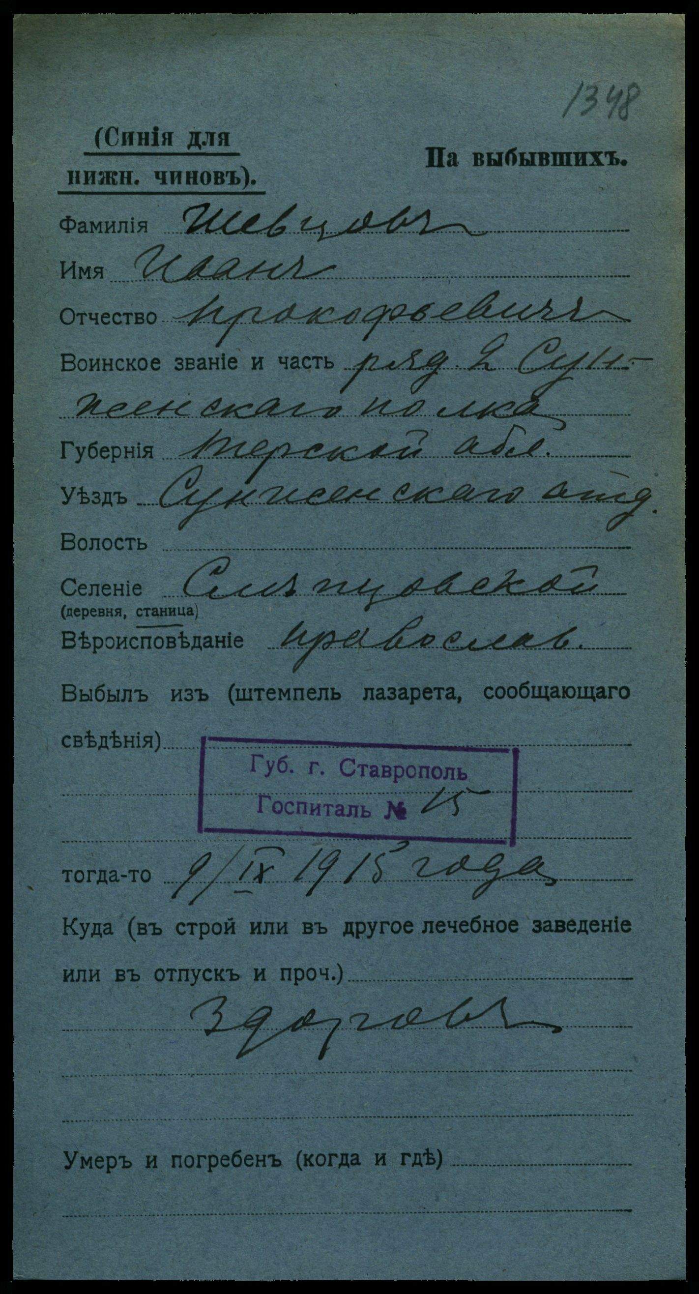 Место рождения Терская обл., Сунженский отдел, стнц. Слепцовская