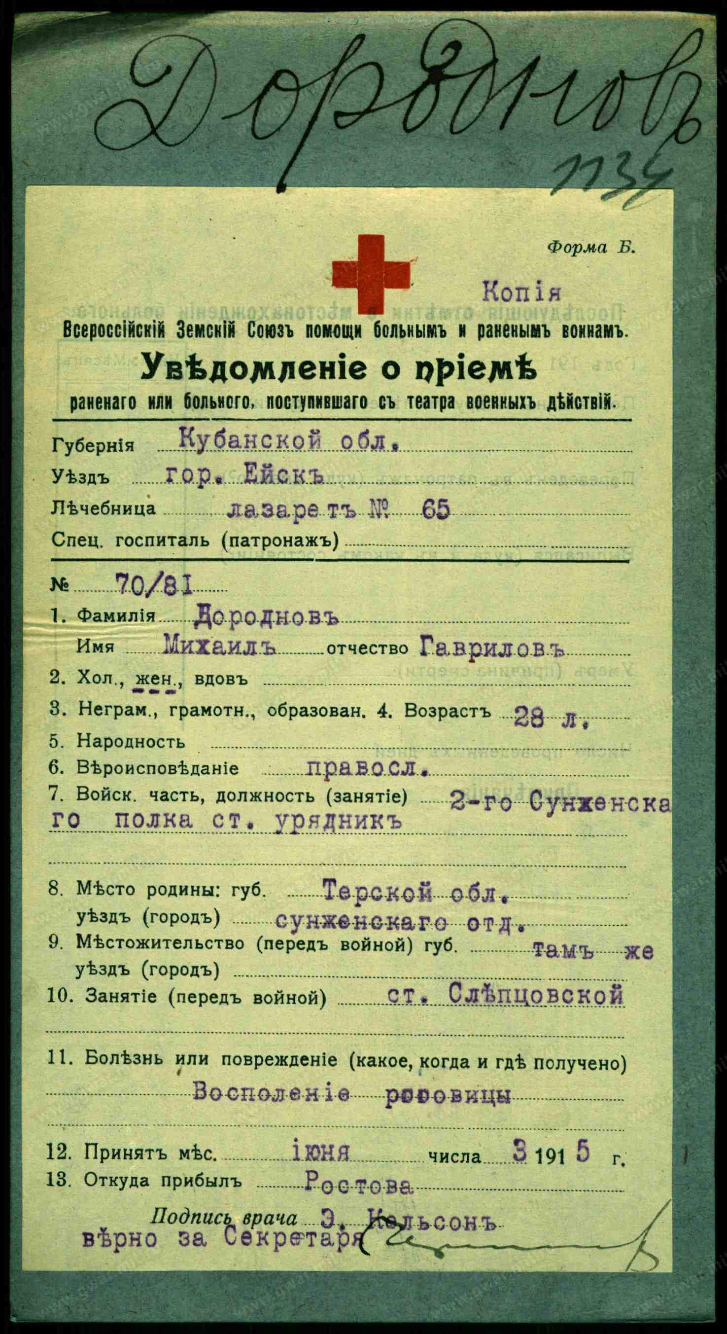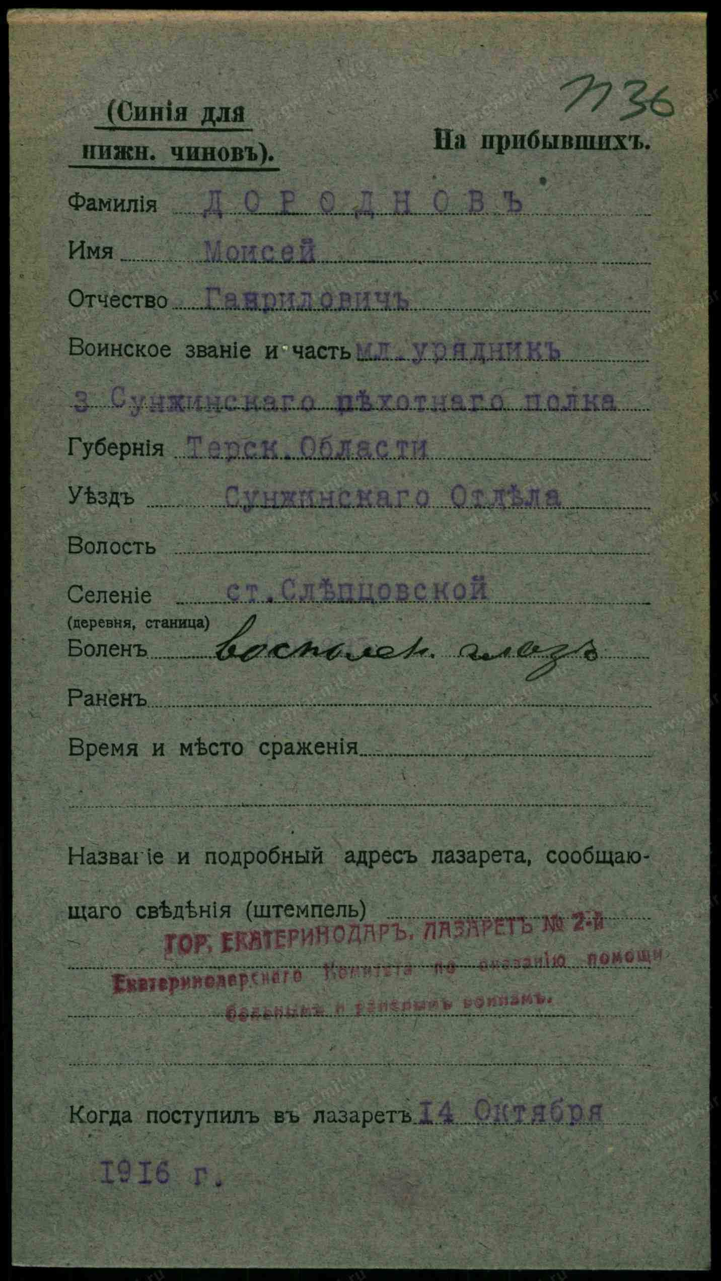 казак Моисей Гаврилович ДОРОДНОВ, ст Слепцовская, женат