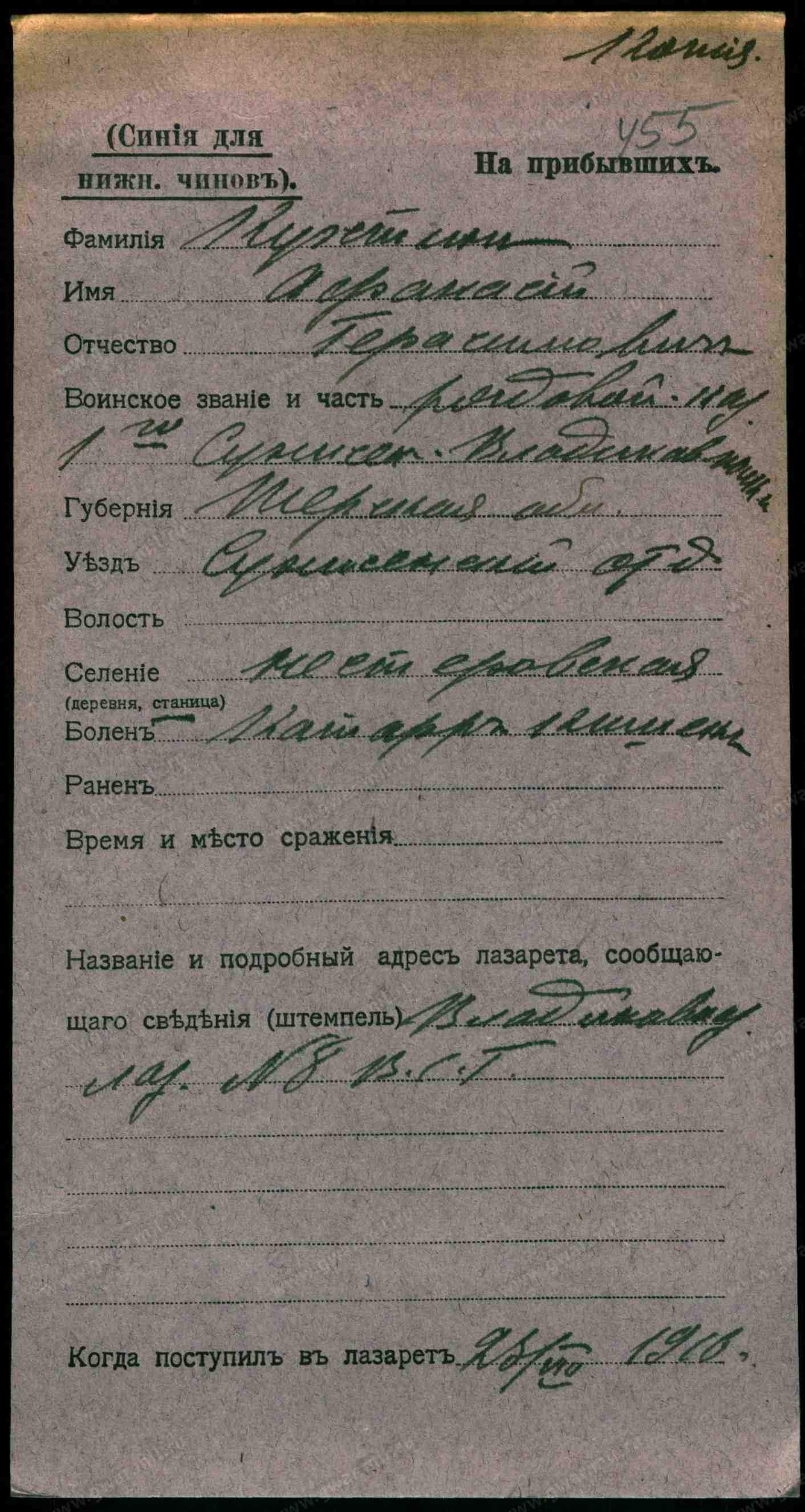 Тип документа Карточка на прибывших (нижние чины)