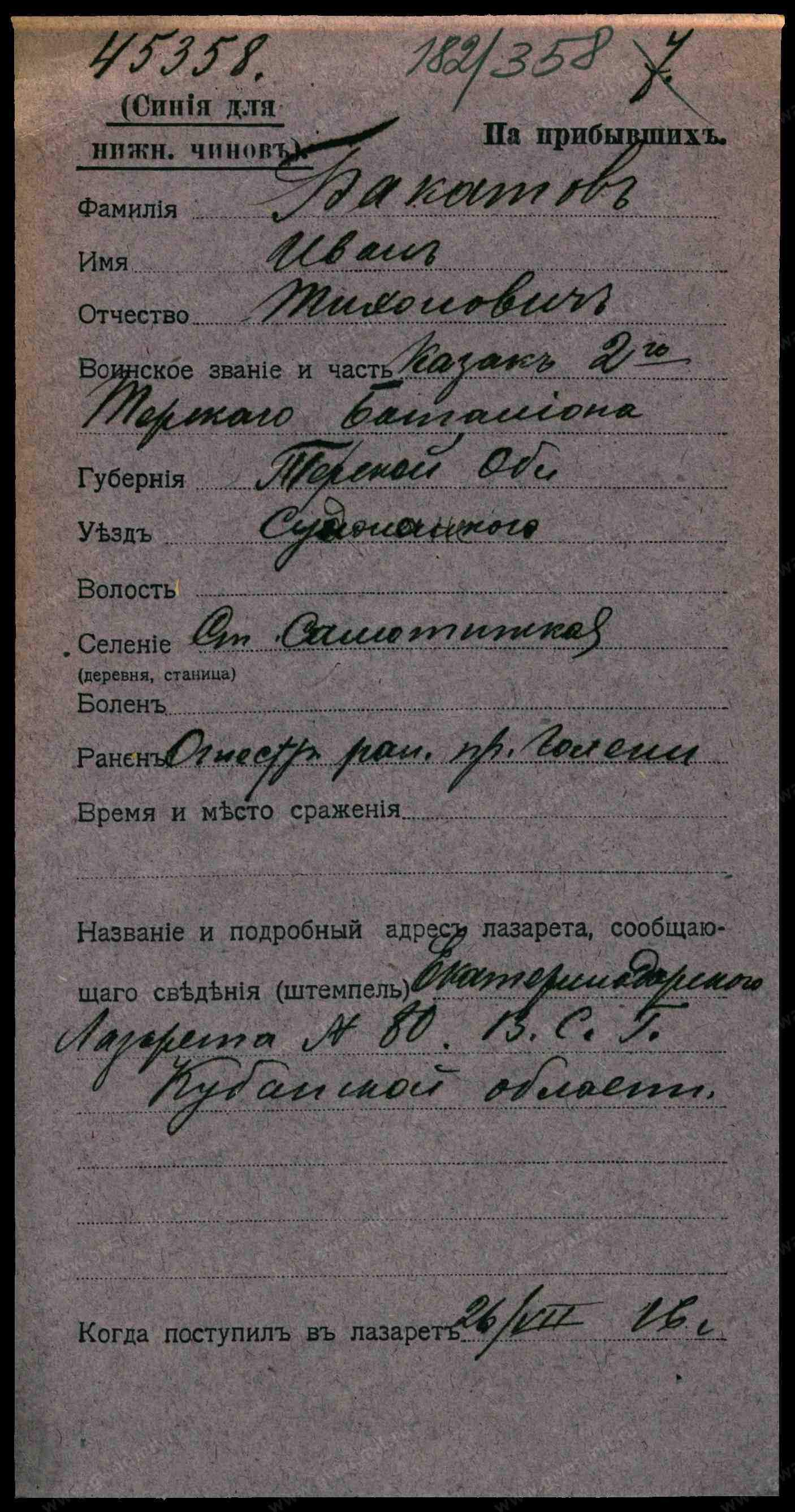 Мещанин города Грозного Григорий Иванов Бокатов, согласно просьбе его и на основании 10-го пункта приказа по военному ведомству 1869 года за № 144 и 4-го пункта 68-й ст. Положение об общественном управлении в казачьих войсках, Высочайше утверждённого 13/25 Мая 1870 года, зачисляется в войсковое сословие Терского казачьего войска с сыном Осипом с водворением на жительство в станице Самашкинской Грозненского округа.