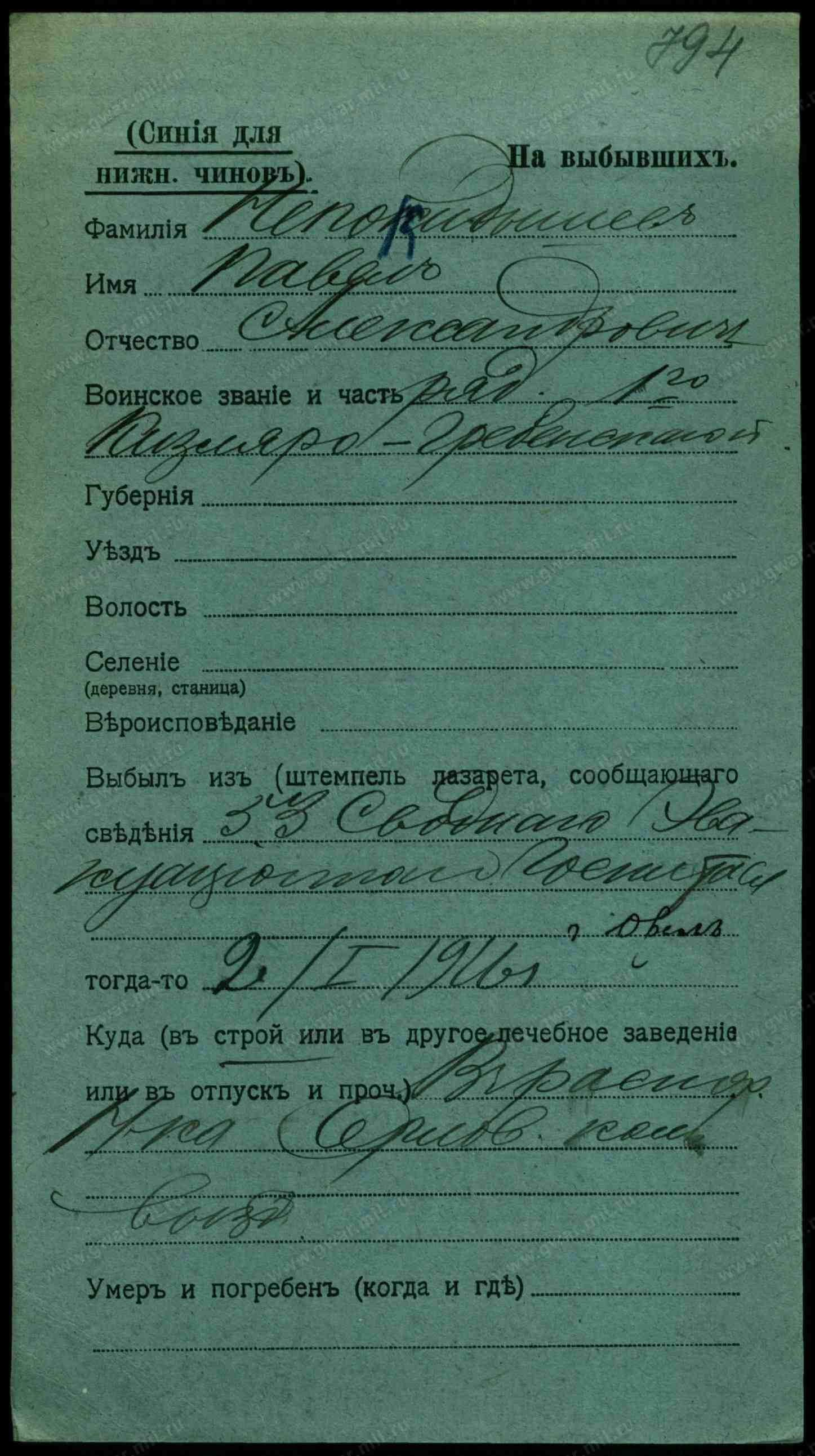 Тип документа Карточка на выбывших (нижние чины)