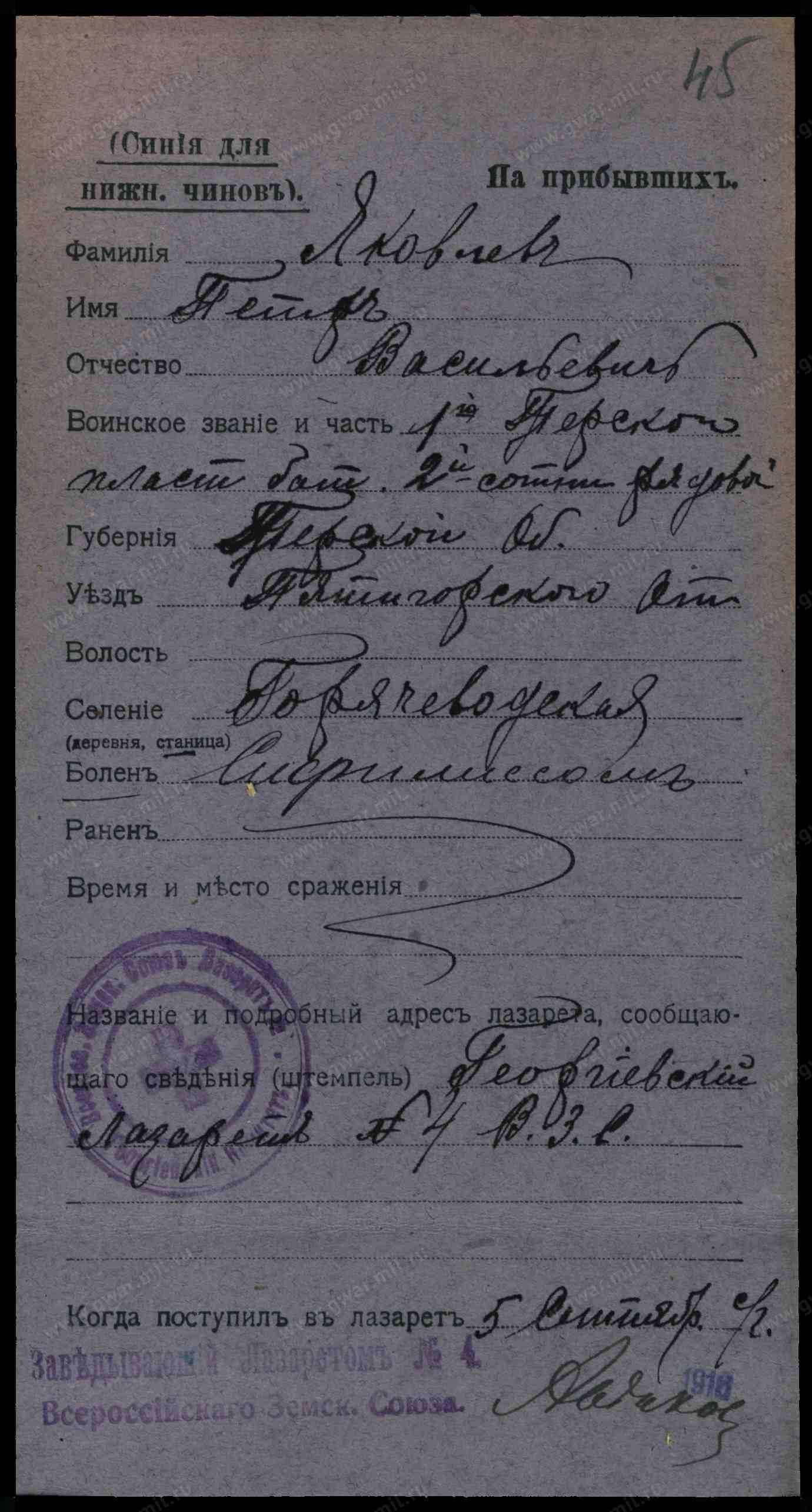 Отставной Урядник Терского казачьего войска, ст. Горячеводской Пятигорского округа Павел Михайлов Яковлев, имеющий от роду 53 года, согласно просьбы его и на основании положения, приложенного к приказу по военному ведомству 1883 года за № 32, исключается из войскового сословия Терского казачьего войска с семейством, состоящим из жены его Федосьи 45, детей: Тимофея 16, Якова 1-го 7, Якова 2-го 6 лет, Варвары 12 и Христиньи 10 лет.