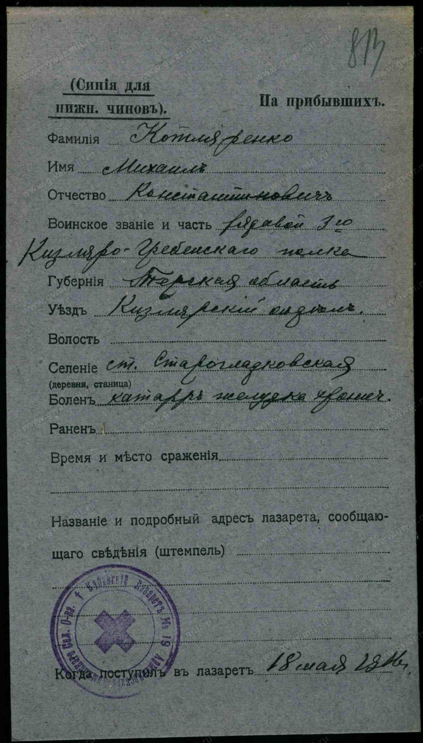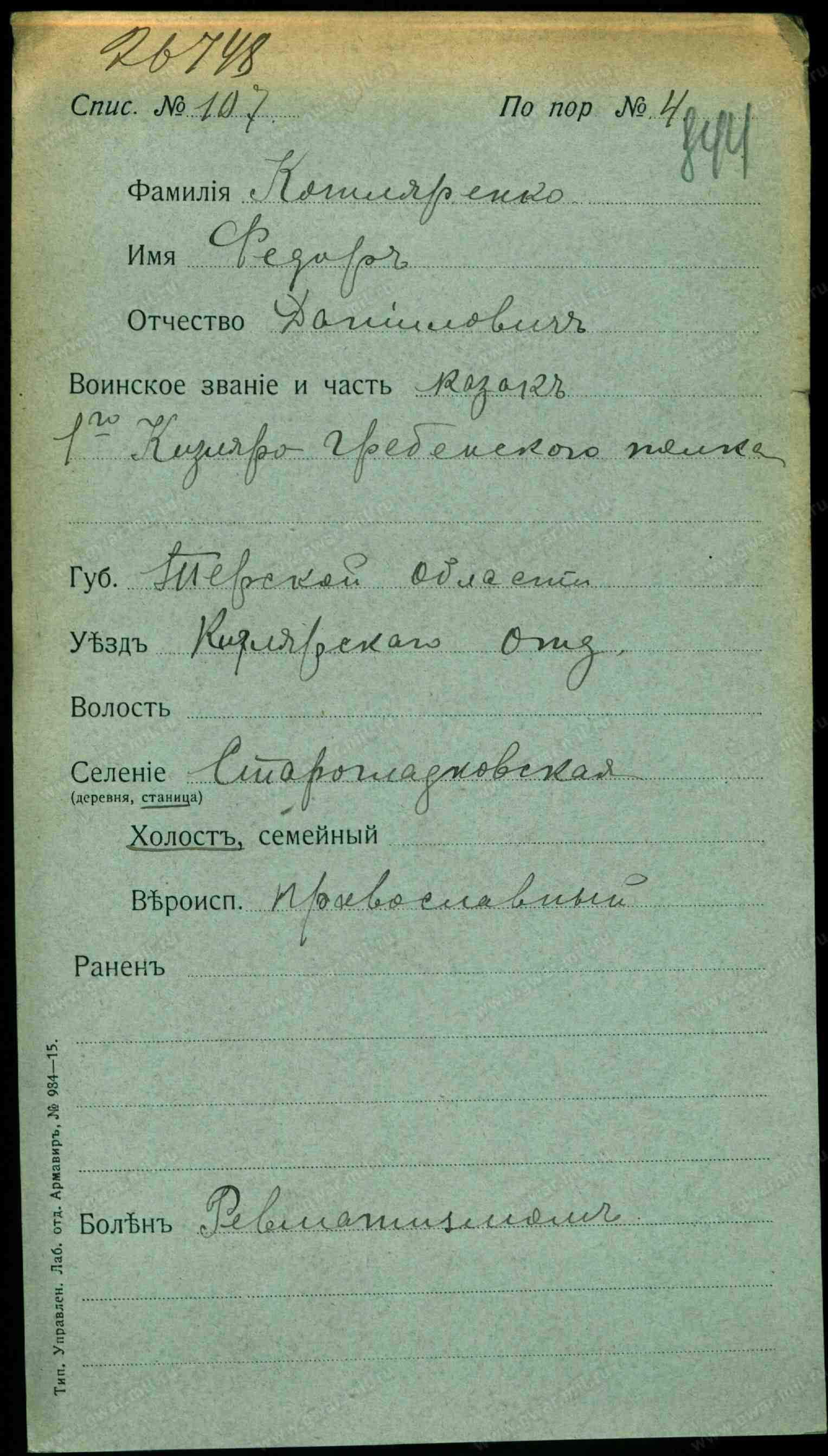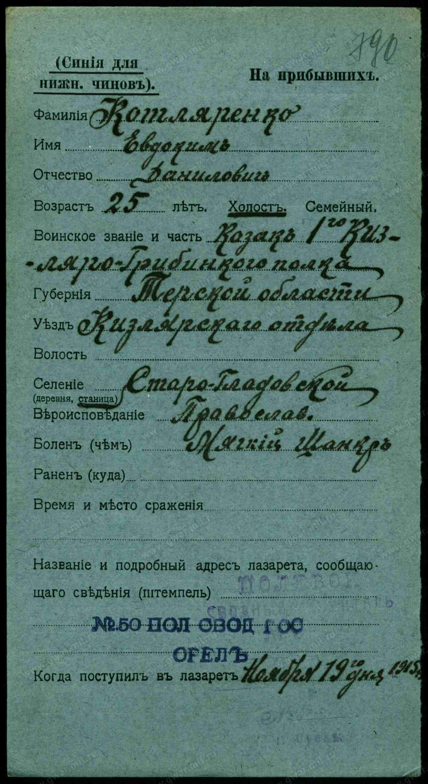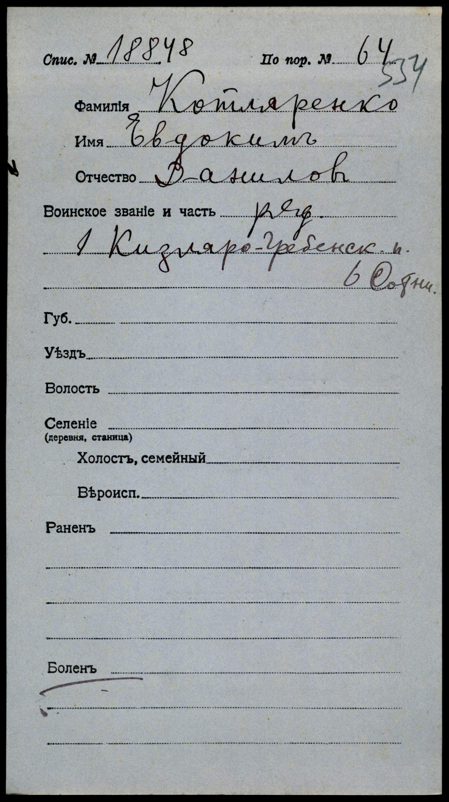 1. Котляренко Илья Антонов, хозяин, 33 года, казак, родился здесь, прав., родной язык русский, грамотный, в ст. школе, виноделие, терский зап. казак.