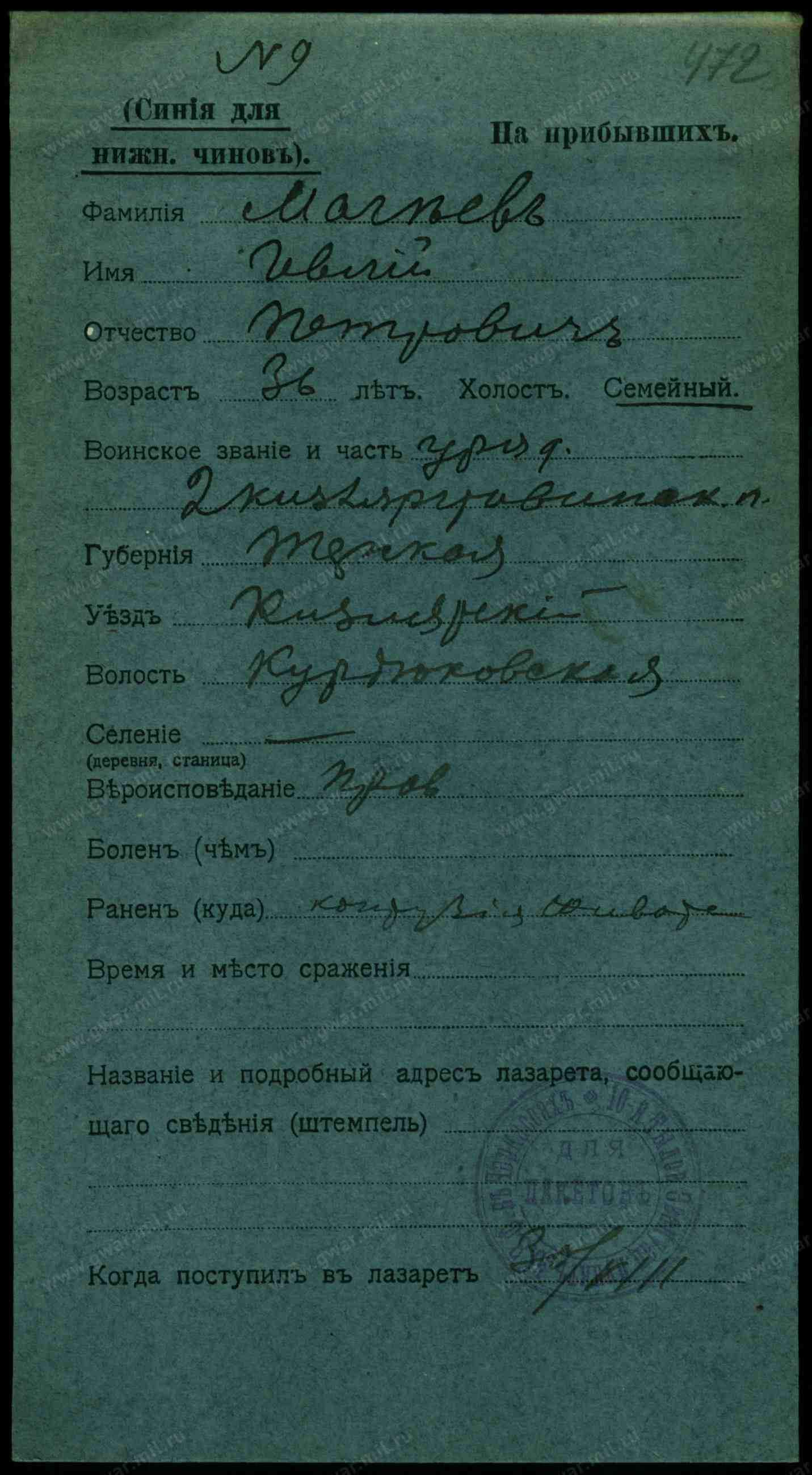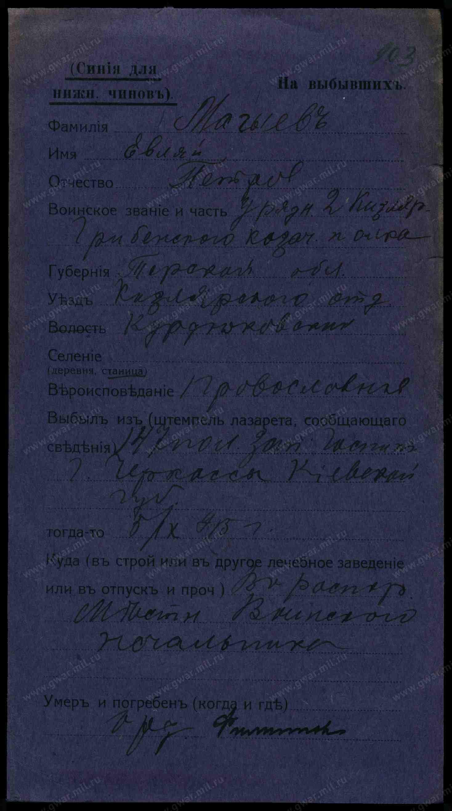 и место жительства жениха и которым браком. — Казак Савва Карпов Золотухин, старообр. станицы Курдюковской, Киз. от., Тер. об. Проживающий на родине, первым браком.