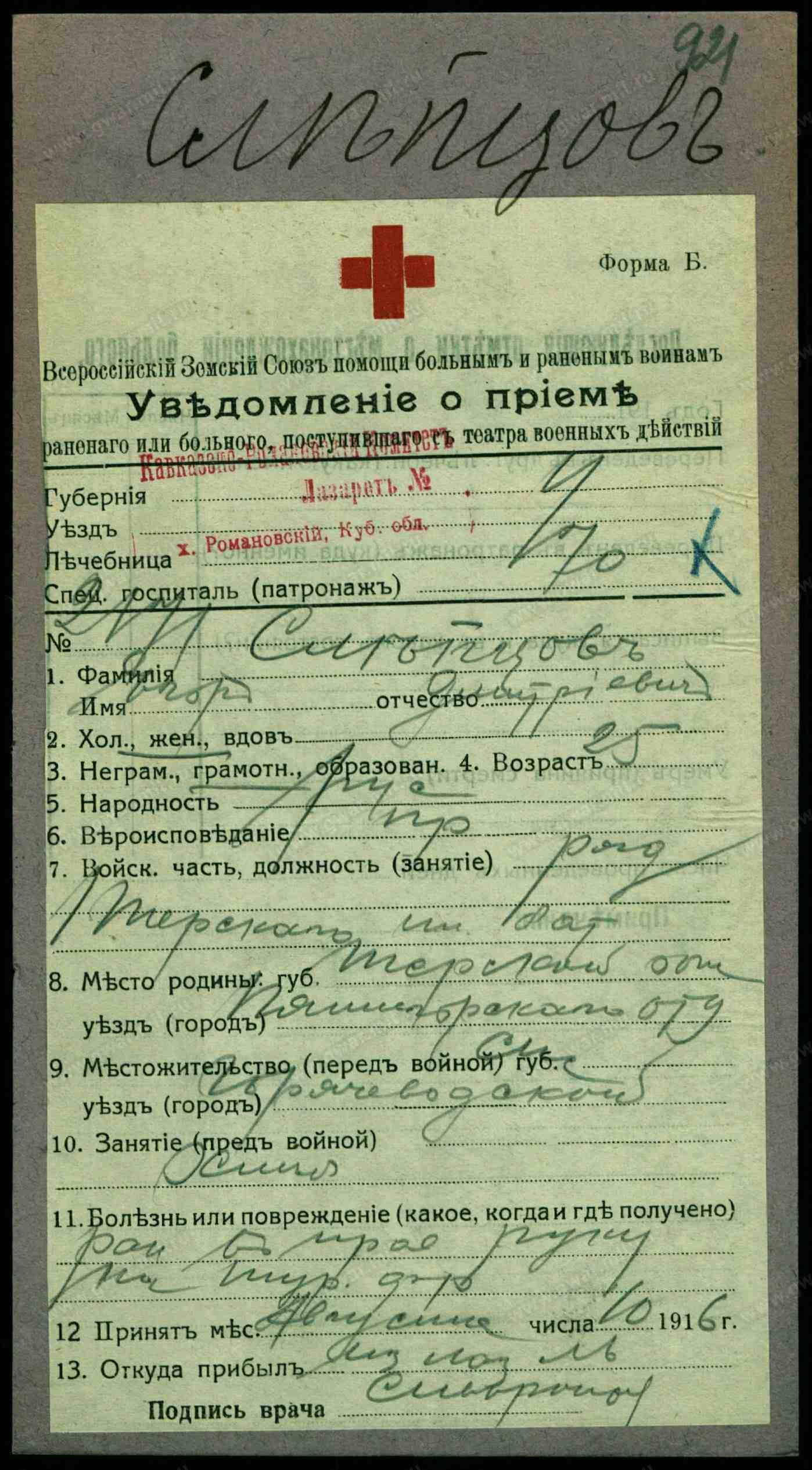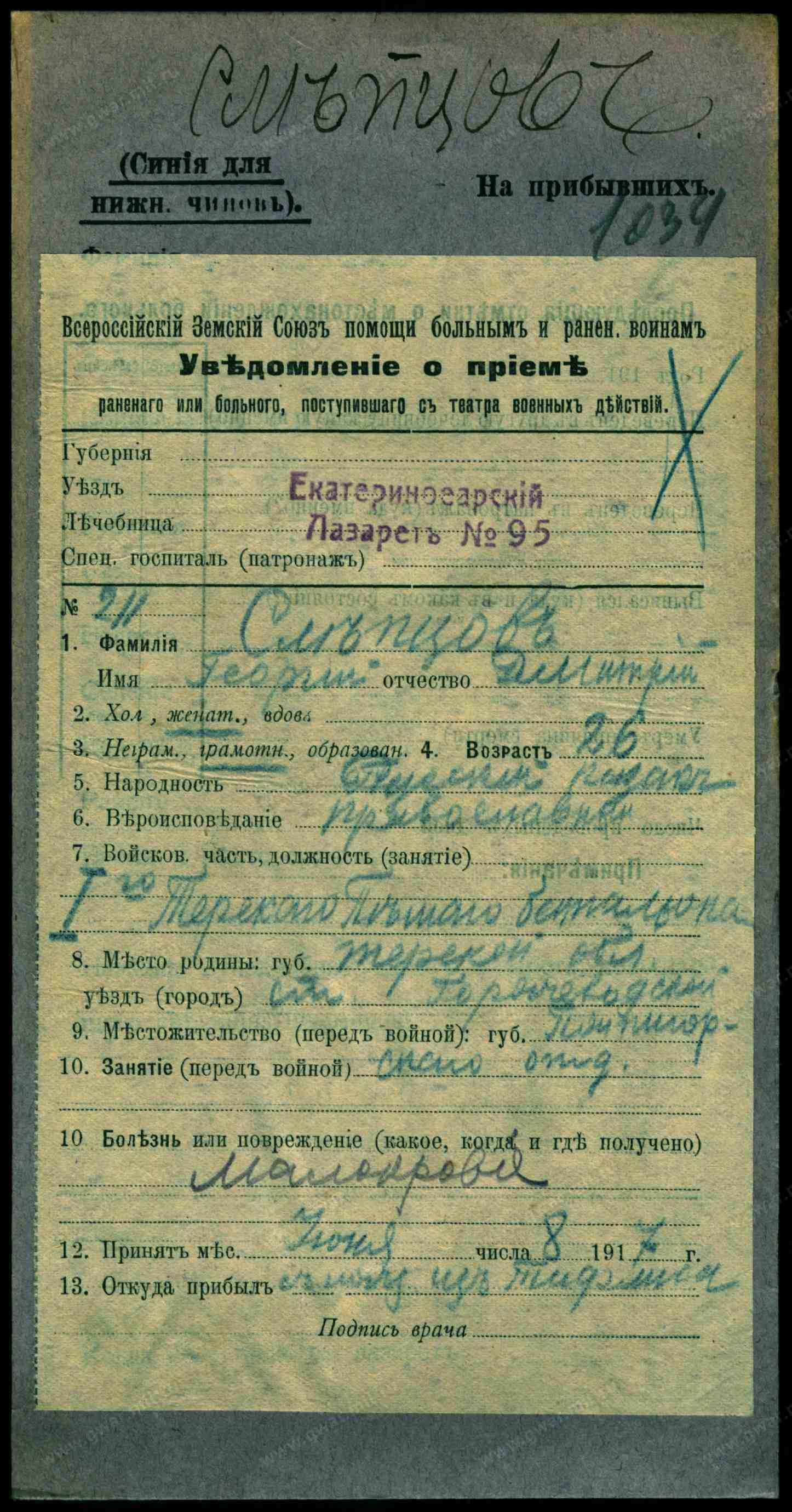 Место рождения Терская обл., Грозненский уезд, стнц. Горячеводская